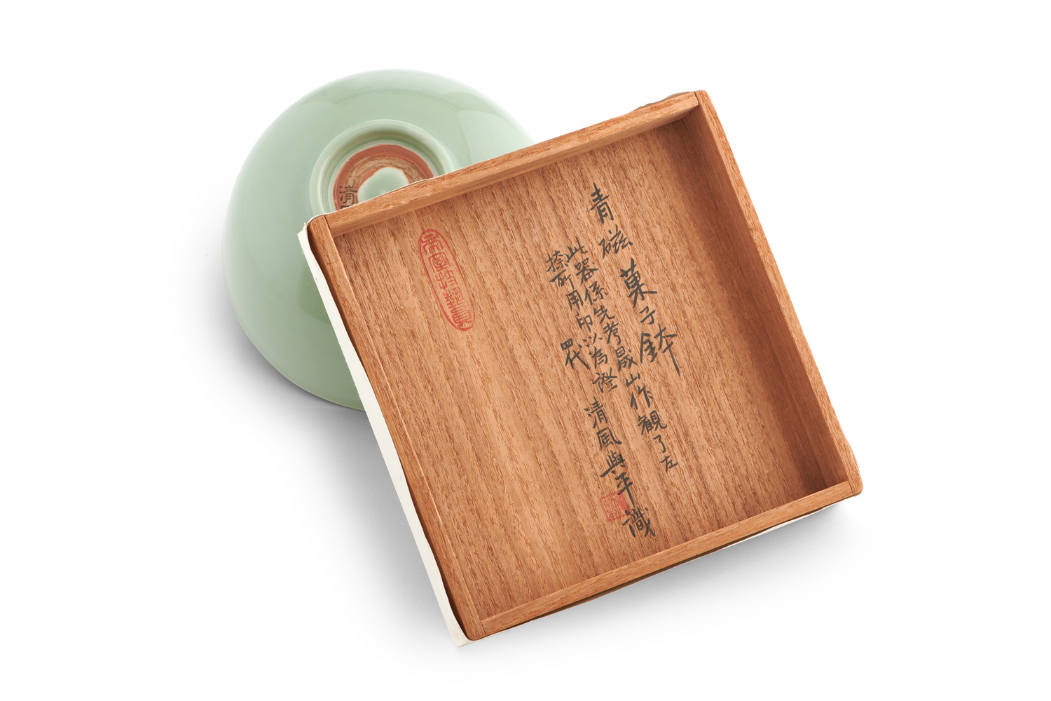 Covered in a sea green celadon glaze with an unglazed ring within the foot rim. Two character incised mark 'Seifu' to the base. Together with an old Japanese wooden box signed by Seifu Yohei IV, and sealed with the Teishitsu Gigeiin.