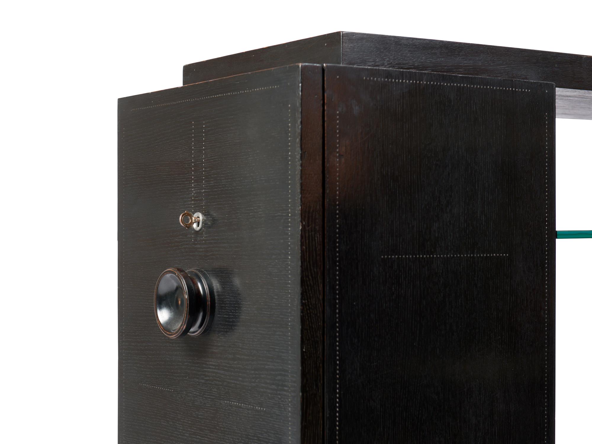 Black Japanned oak with signature cloutage nails. Side cabinet and glass shelves.