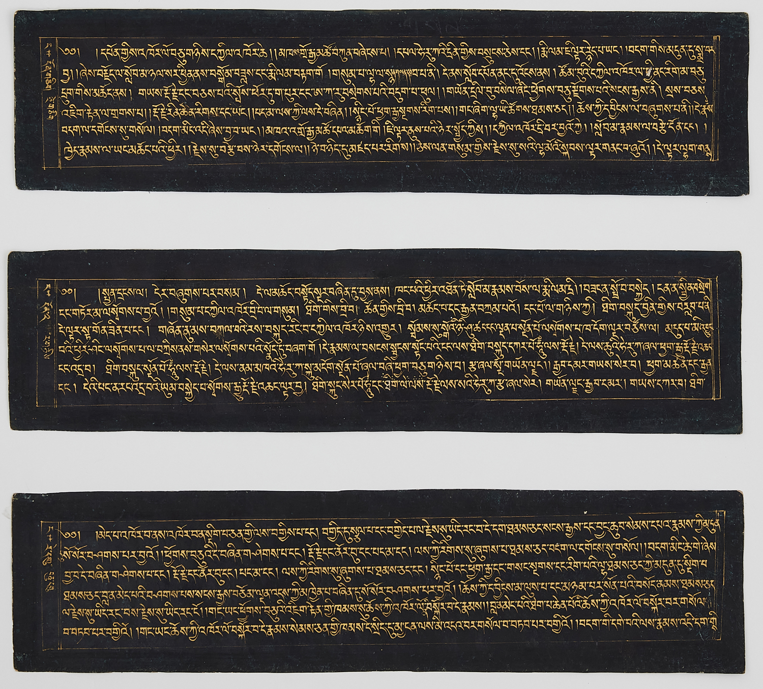 Circa 17th century, the burnished black sutra pages inscribed in gold ink with incantations in Tibetan sanskrit, six unframed, three framed.