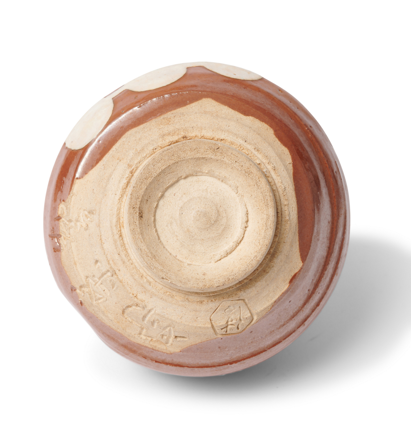 Irregularly potted in stoneware to give a natural, wabi quality, covered in a rich kaki-yu (persimmon glaze), with white enamel decoration of a skewer of dango sweets