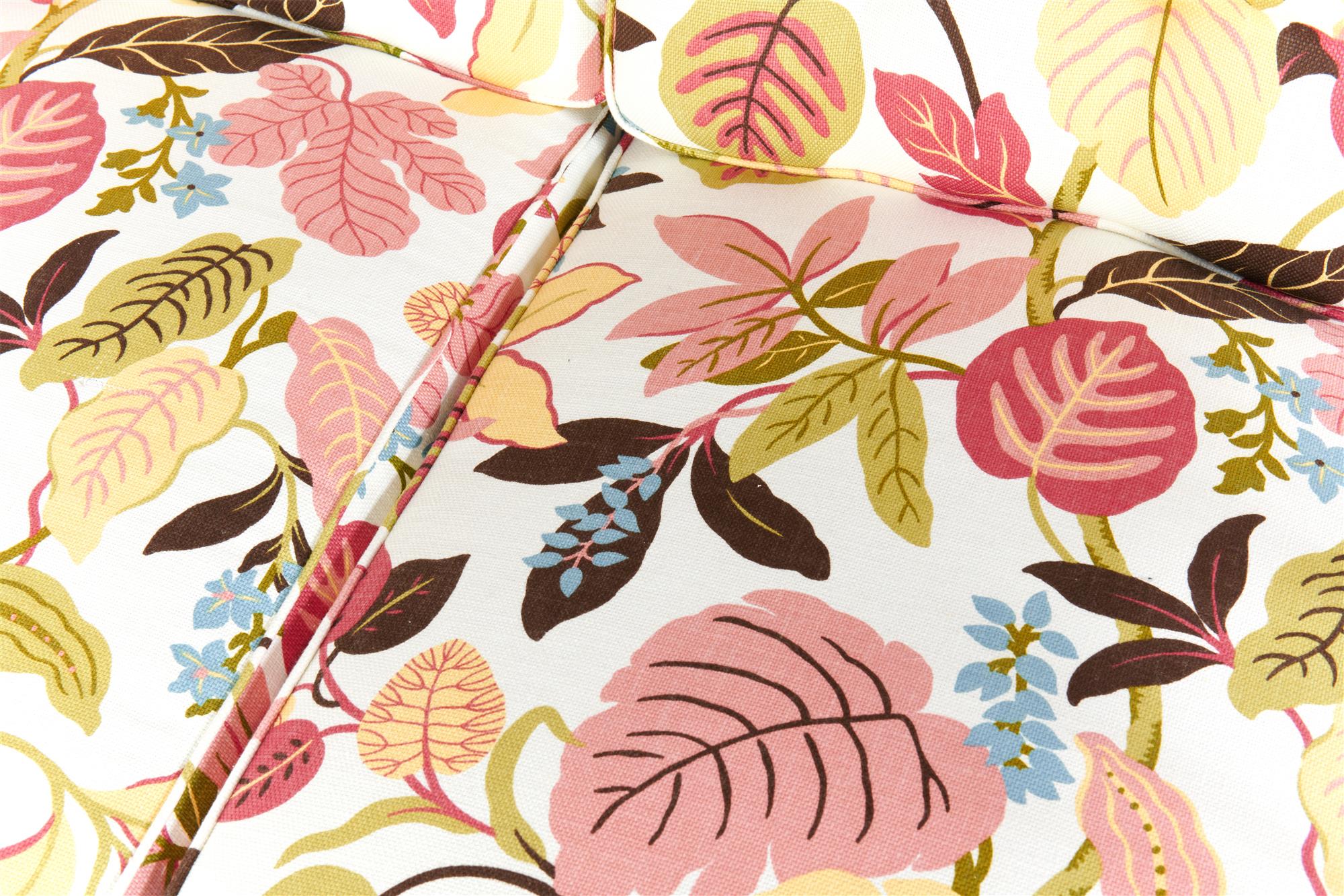 This piece has been restored and recovered in a high quality abstract floral linen fabric. There is a very minor fabric pull to one of the central cushions. Structurally sound.