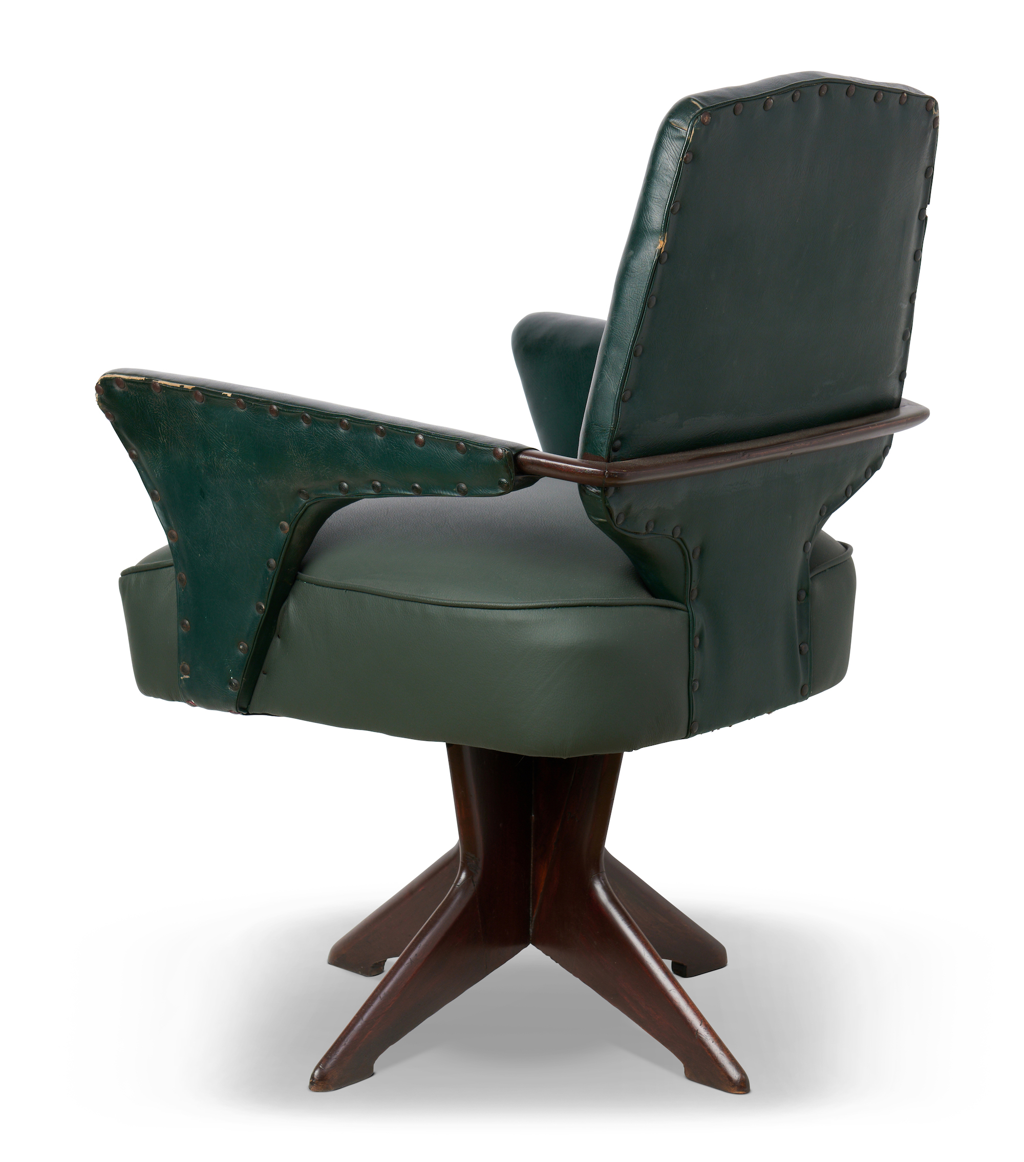 Swivel timber base, green leather with studded arms.