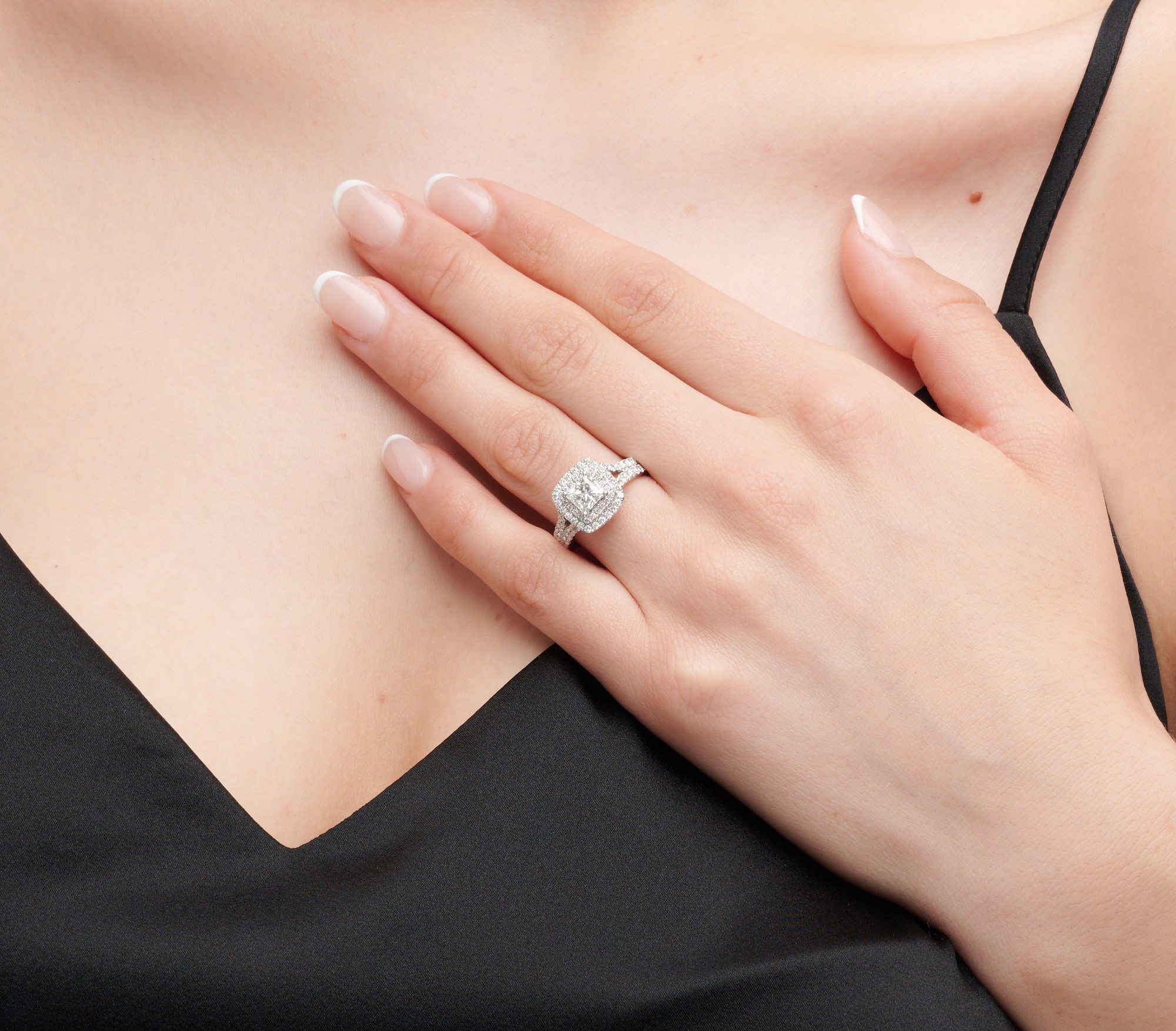 Of cluster design, centring a corner-set princess-cut diamond weighing approximately 1.00 carat, within a double surround, split shoulders and underbezel detailed with brilliant-cut diamonds together weighing approximately 1.42 carats, size M.