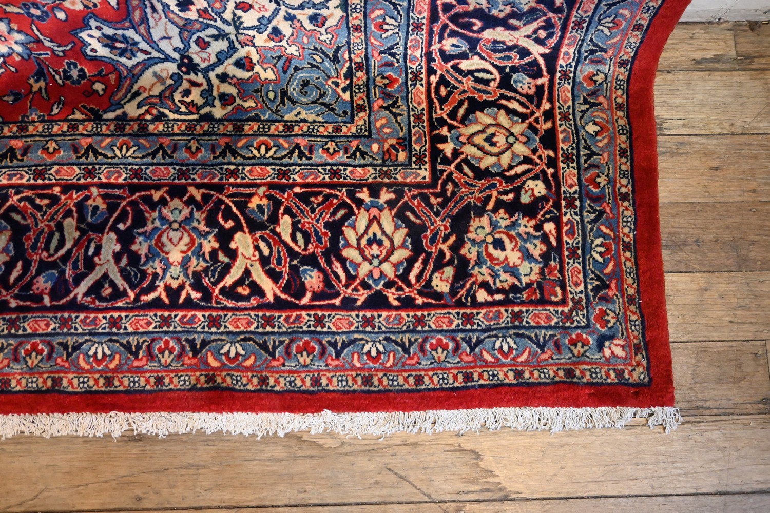 A MAGNIFICENT FINELY HAND-KNOTTED PERSIAN SAROUQ CARPET. 100% PLUSH WOOL PILE. SOLID AND DENSE. CLASSIC SAROUQ DESIGN OF CENTRAL MEDALLION OF PALMETTES AND QUARTERED CORNER MEDALLIONS IN A RED FIELD OF PALMETTES, BLOSSOMING FLORAL SPRAYS AND TENDRILS. BORDER OF PALMETTES AND FLORAL SPRAYS. SIZE: 367 X 272 CM ORIGIN: PERSIA - RRP: $9,500 CERTIFICATE OF AUTHENTICITY INCLUDED