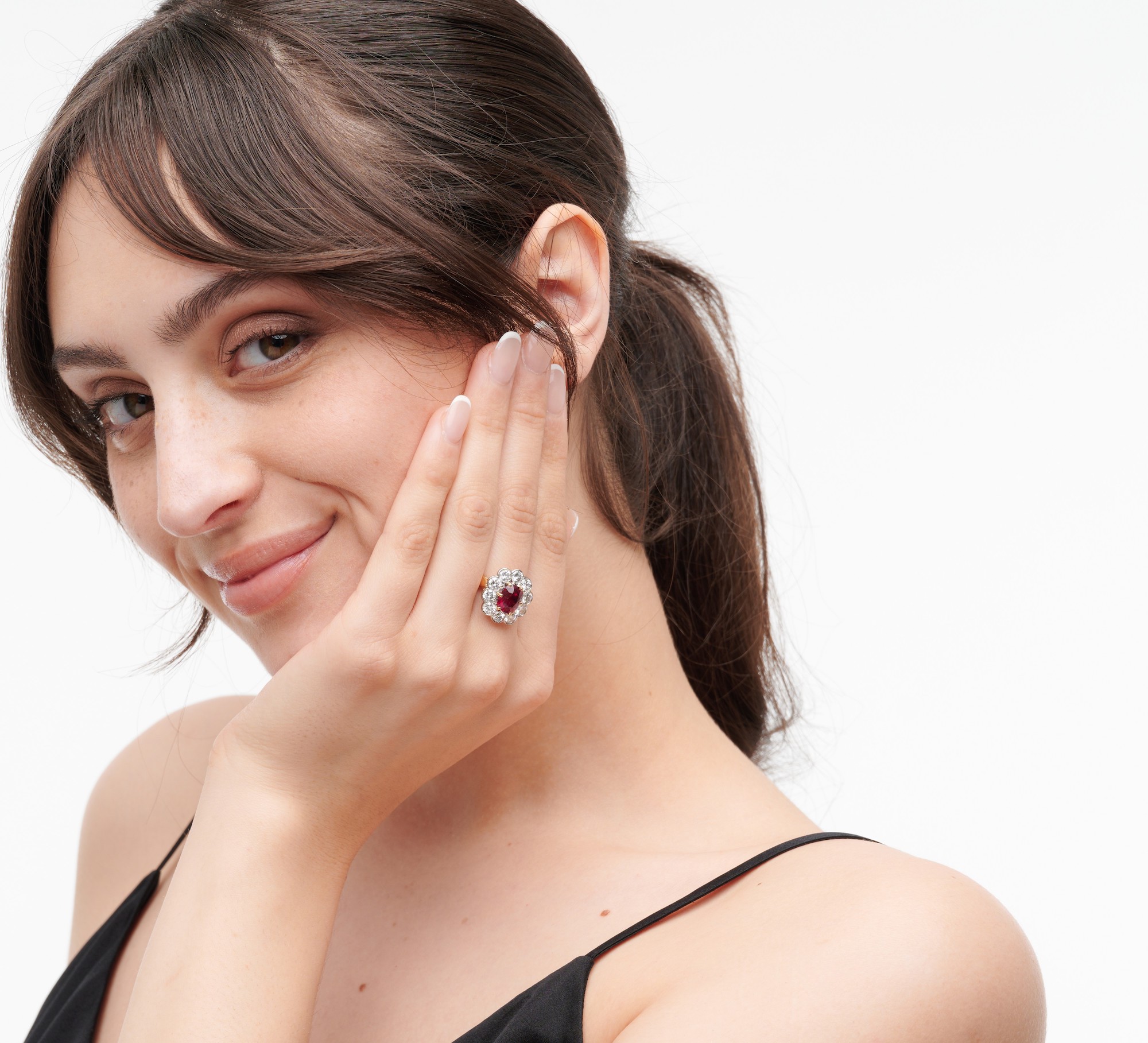 Of cluster design, centring a claw-set cushion-cut ruby weighing approximately 3.20 carats, within a surround of ten brilliant-cut diamonds together weighing approximately 2.25 carats, size Q.