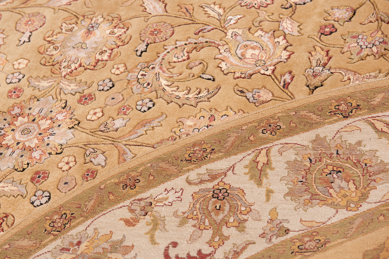 A SUPERFINE HAND KNOTTED AMRITSAR KASHAN ROUND RUG. FINELY KNOTTED EMBOSSED DESIGN. WOOL AND SILKY TEXTURE. EXTREMELY SOLID AND DENSE. SIZE: 239 X 240 CM ORIGIN: PERSIA – RRP: $7,900 DOCUMENTATION OF AUTHENTICITY INCLUDED.