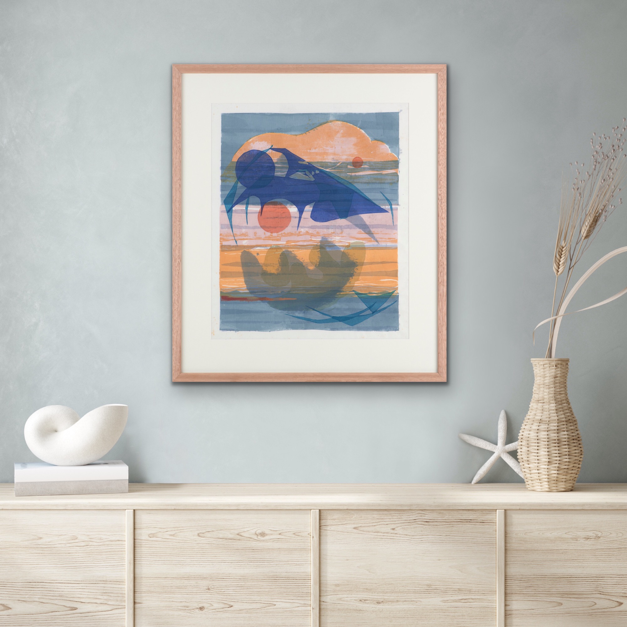 "Printed on Japanese paper from eight separate stencils, Sea Fringe explores the interplay of light and water. Brash portrays this other-worldly seascape with an economy of form, reducing the earth, sky and ocean to elemental volumes and blocks of colour. ‘Strangely, the paper itself seemed to suggest the colours and shapes I used', Brash revealed of the work in an interview with The Sun in 1963." (Geelong Art Gallery, Victoria)