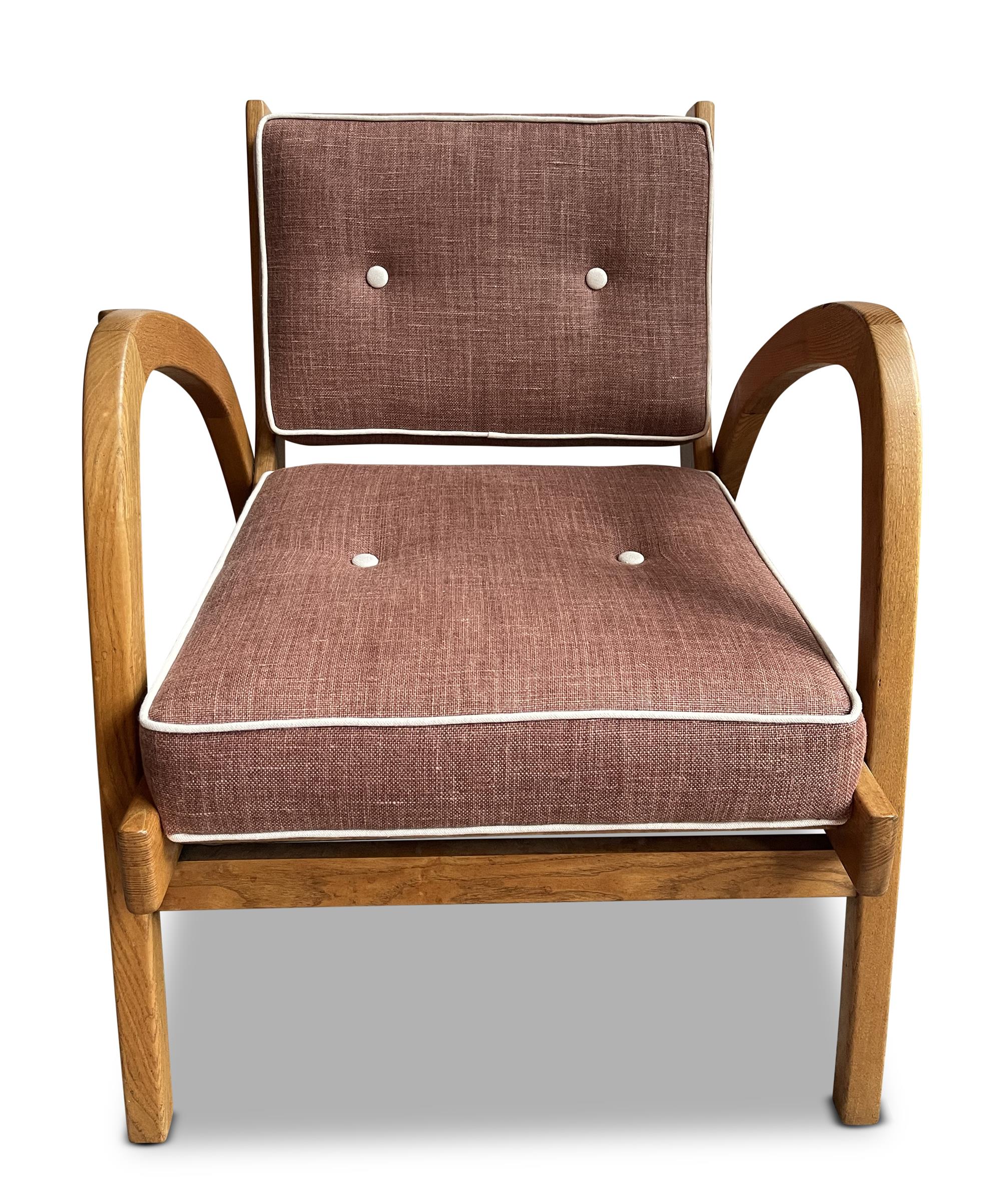 Solid oak frame, brand new cushions upholstered in quality cotton.