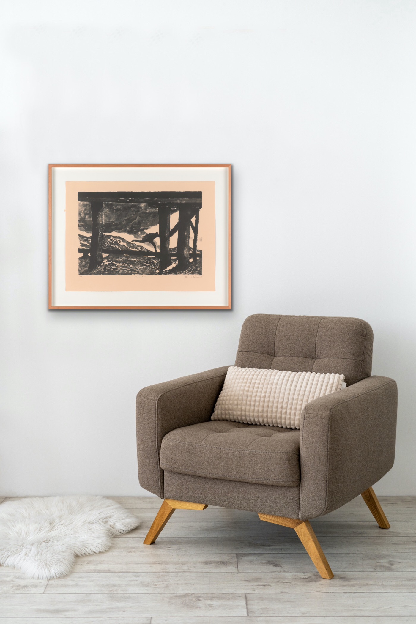 This print is in very good condition, no apparent faults are seen. The work is floating within a lightly stained timber frame behind glass, minor wear seen 74.5 x 92.5cm.