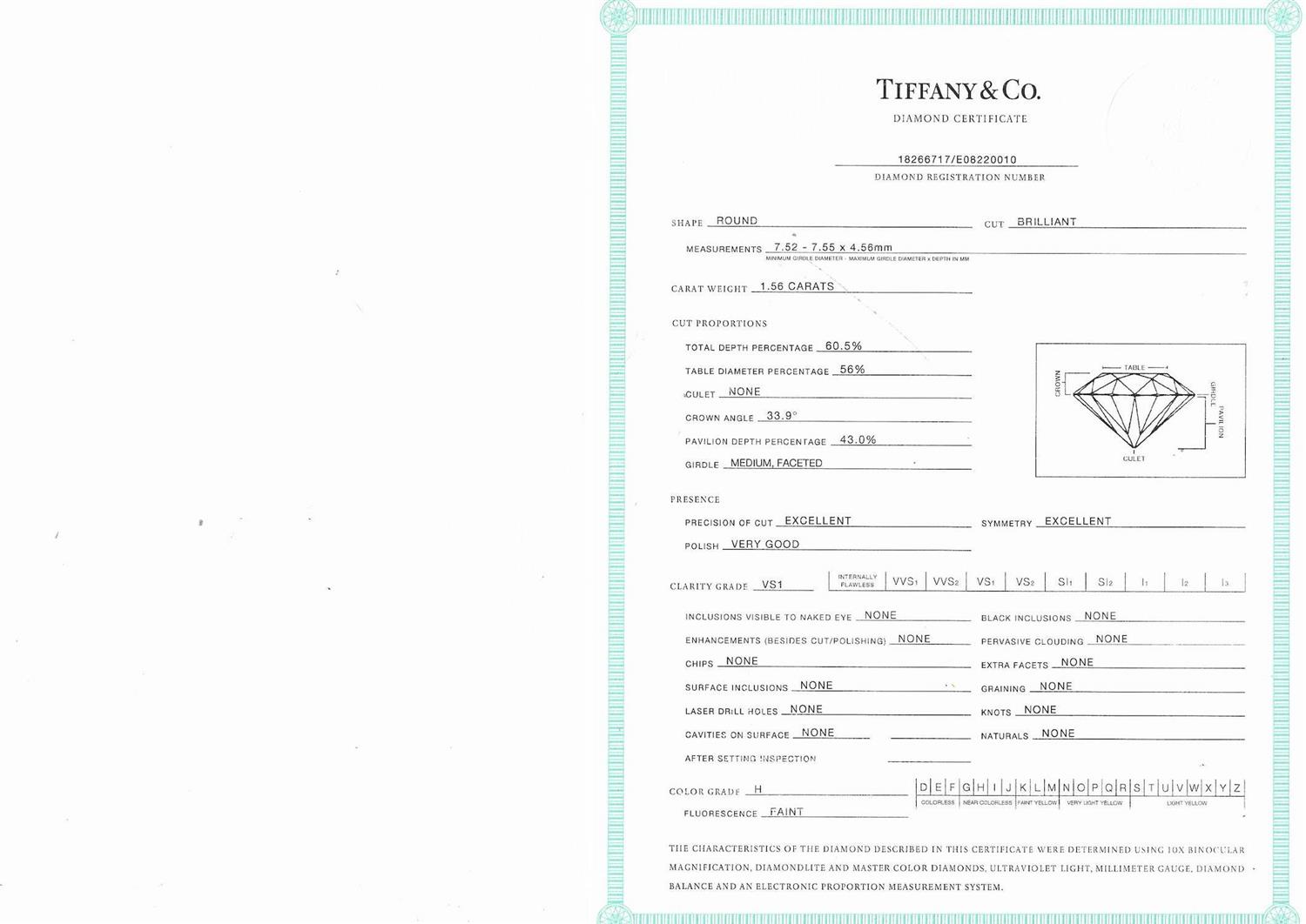 a Tiffany & Co. Diamond Certificate numbered 18266717/E08220010, stating that the 1.56 carat diamond is H colour, VS1 clarity;