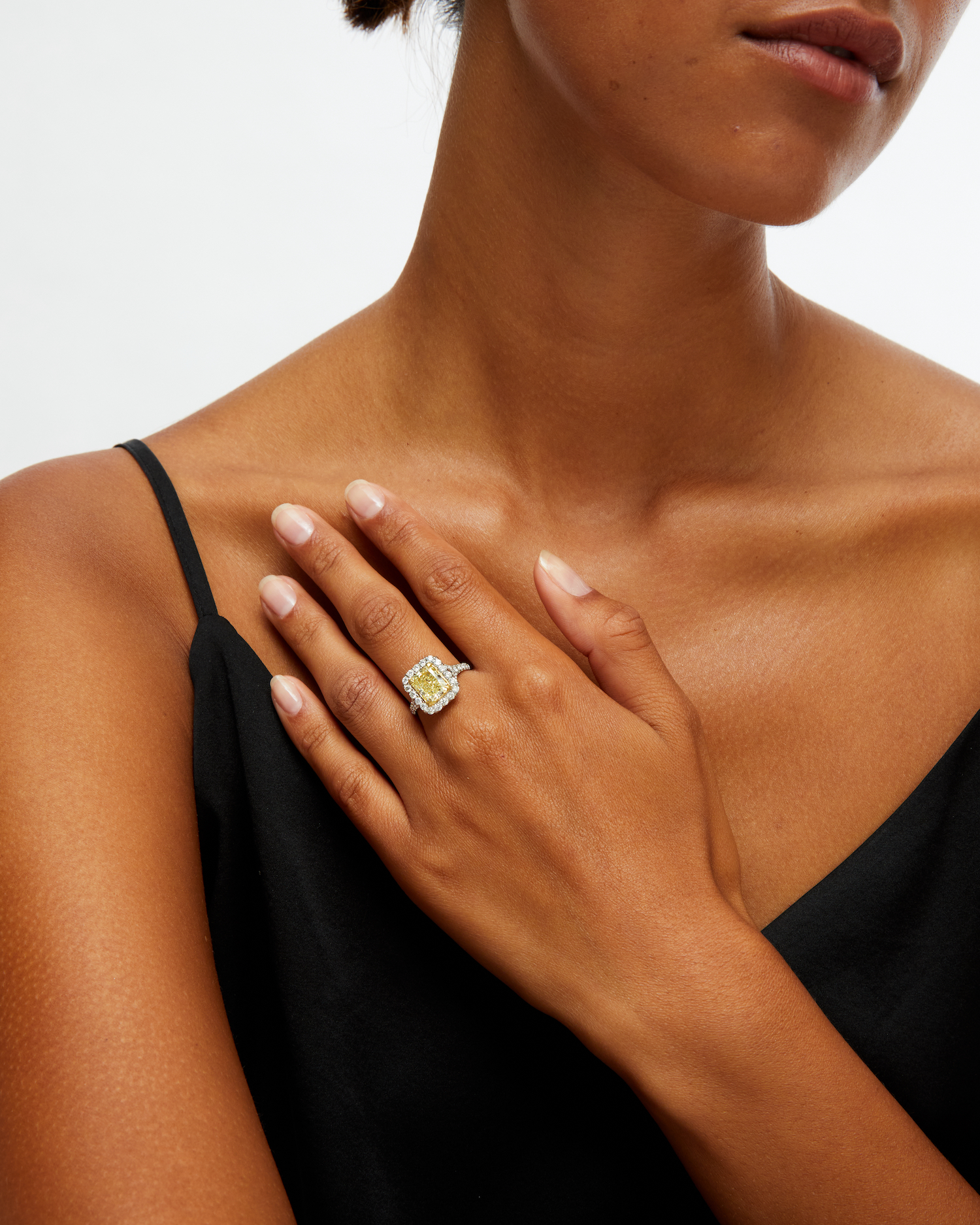 Of cluster design, centring a claw-set cut-cornered rectangular modified brilliant-cut fancy yellow diamond weighing 3.01 carats, framed by a halo of near colourless brilliant-cut diamonds to similarly set shoulders, the small diamonds together weighing approximately 1.01 carats, mounted in platinum and 18ct gold, size M1/2.