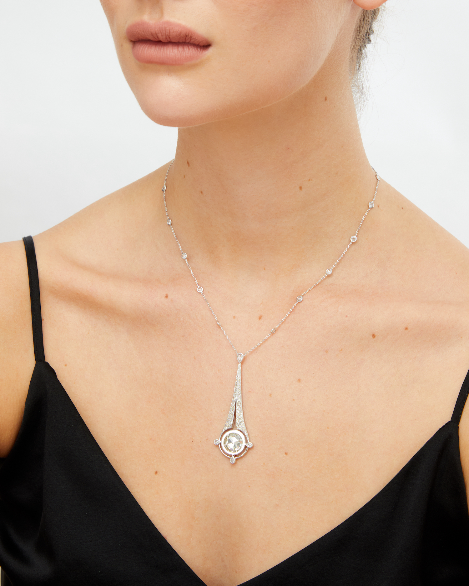 Terminating on a geometric motif centring a collet-set rose-cut diamond weighing approximately 3.07 carats, partially framed by pear-shaped rose-cut and brilliant-cut diamonds supported from a trace link chain decorated at intervals with circular-cut diamonds, mounted in 18ct white gold, pendant length 62mm, inner circumference 435mm.