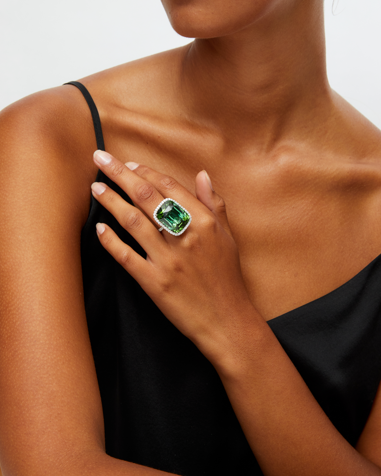 Of cluster design, centring a claw-set cushion-shaped green tourmaline weighing approximately 42.86 carats, framed by a halo of brilliant-cut diamonds, to similarly set shoulders, the small diamonds together weighing approximately 1.16 carats, mounted in platinum, size M1/2.