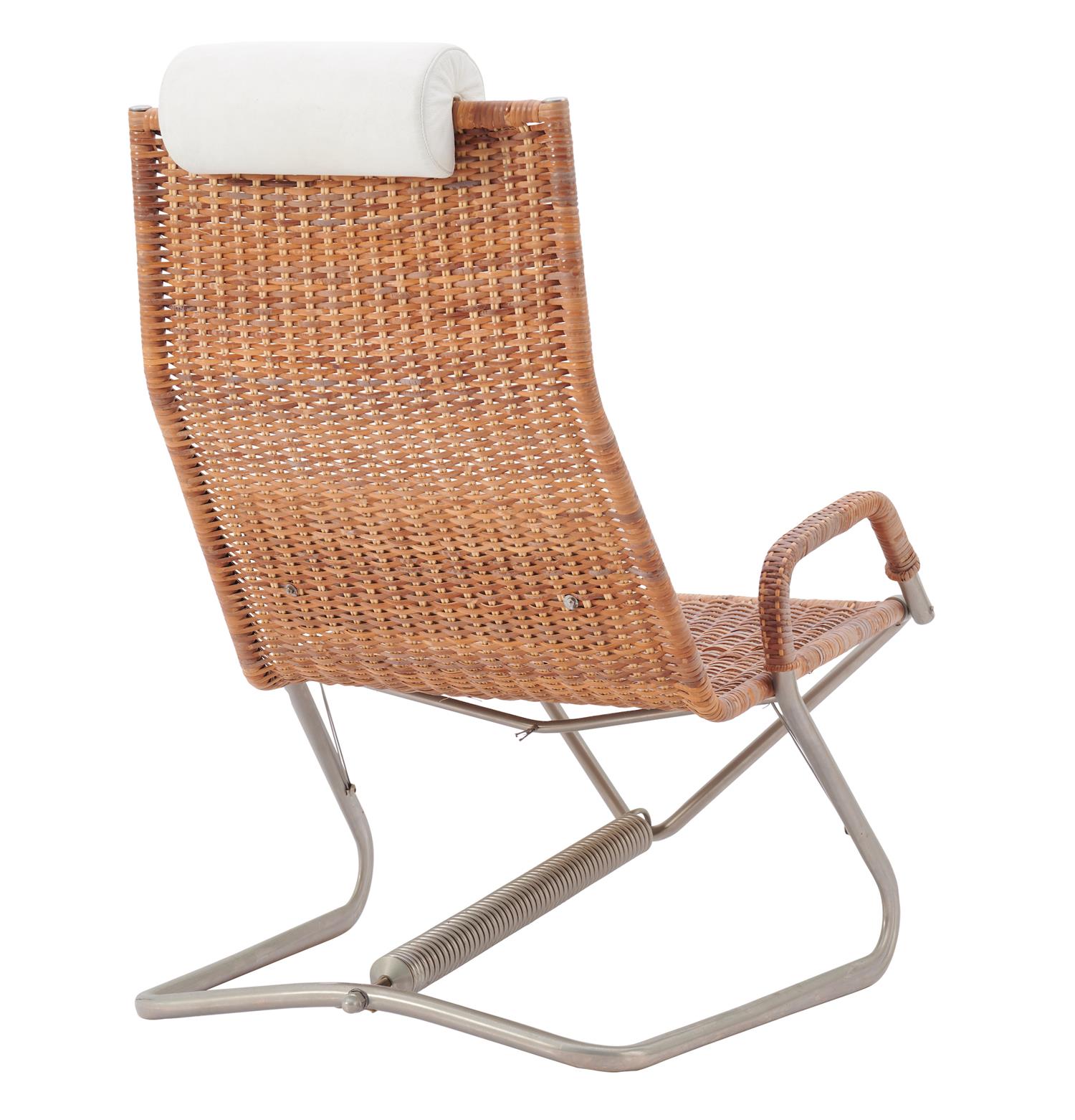 Chrome-plated frame with woven cane seat and back. White vinyl cushions.