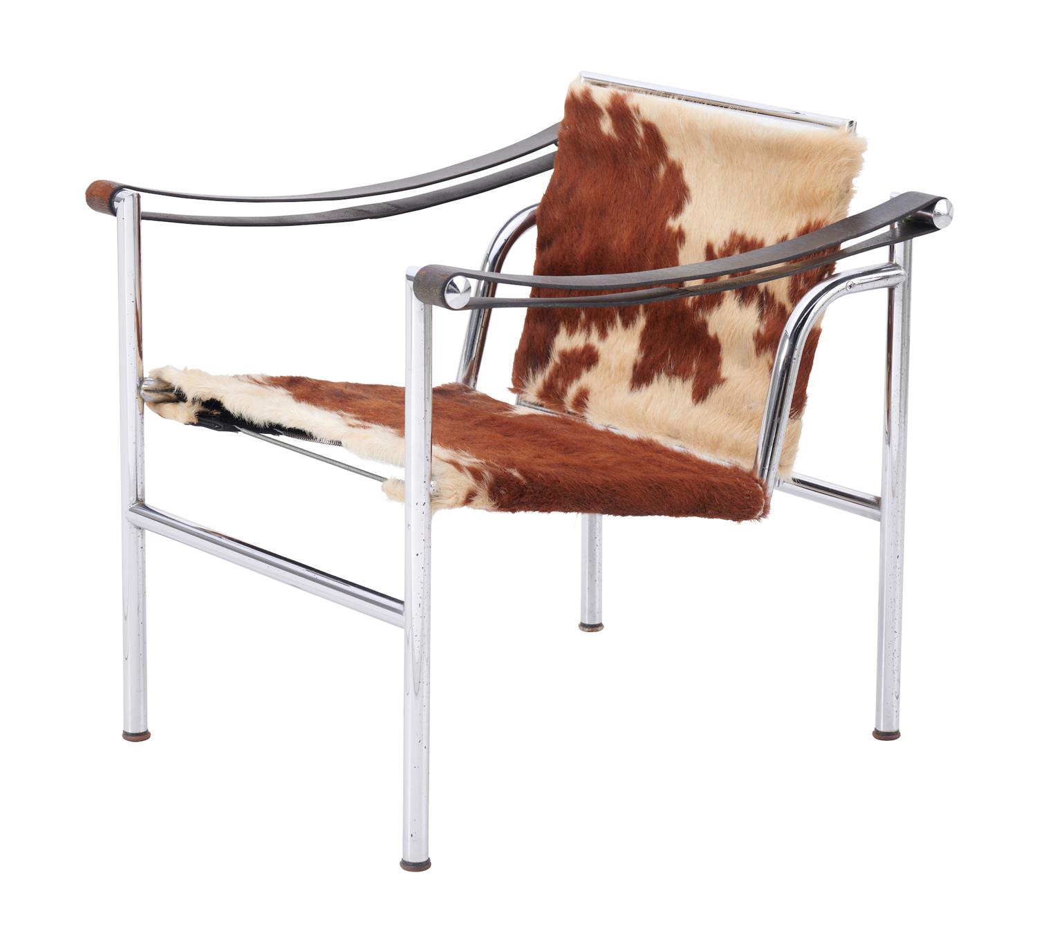 Extensive cracks and losses to leather arms overall, particularly where leather rests against metal frame. Wear and minor losses to cowhide and some natural irregularities consistent with material. Springs on chair back in good order. One spring to chair base is loose. Tarnish to metal frame overall.