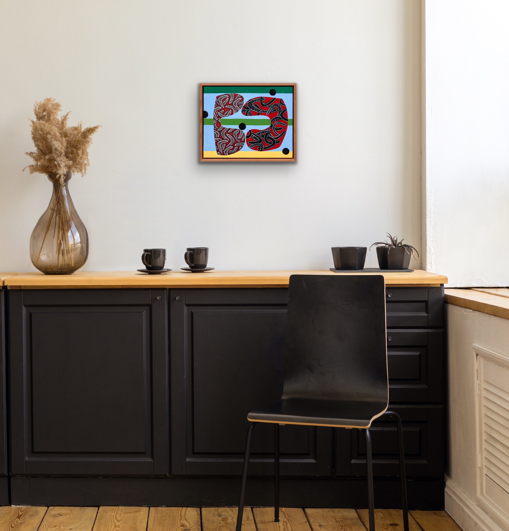 synthetic polymer paint and vintage appropriated Aboriginal fabric on canvasboard