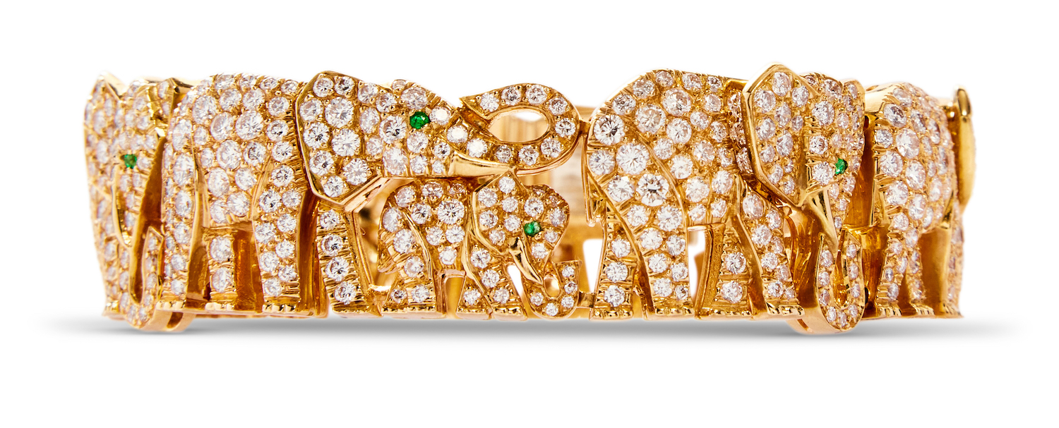 The 18mm wide strap is designed as a continuous series of mother and calf elephant motifs accented with circular-cut emerald eyes, the bodies pavé-set with brilliant-cut diamonds, the diamonds together weighing 8.00 to 10.00 carats, mounted in 18ct gold, length approximately 165mm, numbered 7XXXX9, French assay and maker's mark (Pierre Brun), signed Cartier.