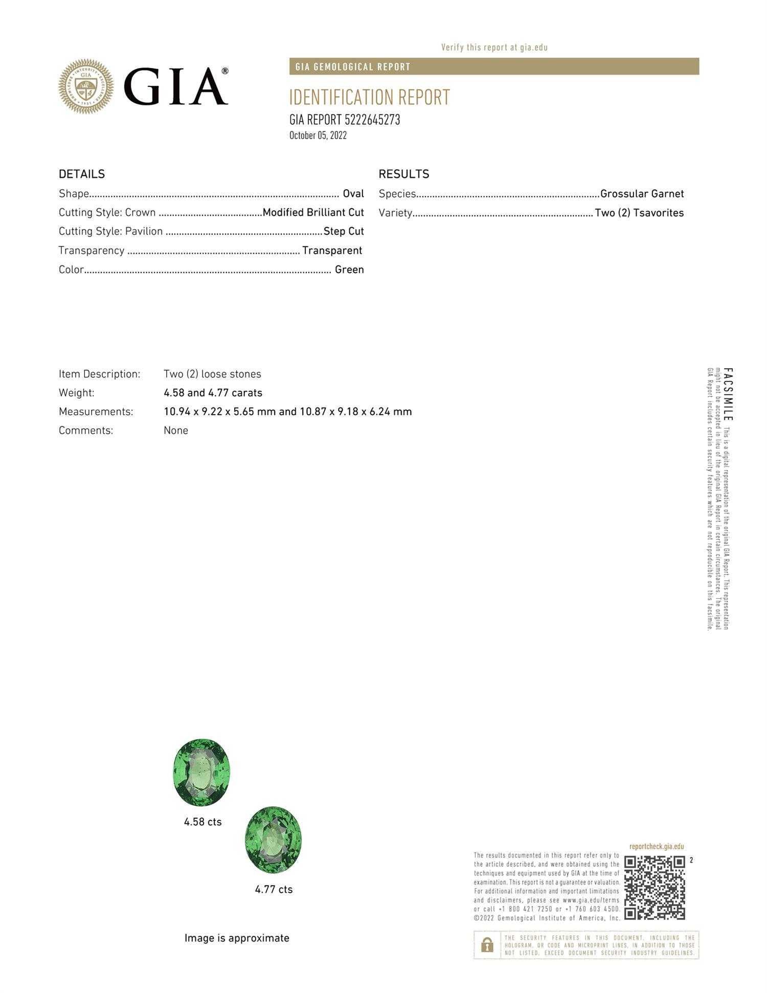 Accompanied by a GIA report numbered 5222645273, dated 5 October 2022, stating that the 4.58 carat and 4.77 carat tsavorites are natural.