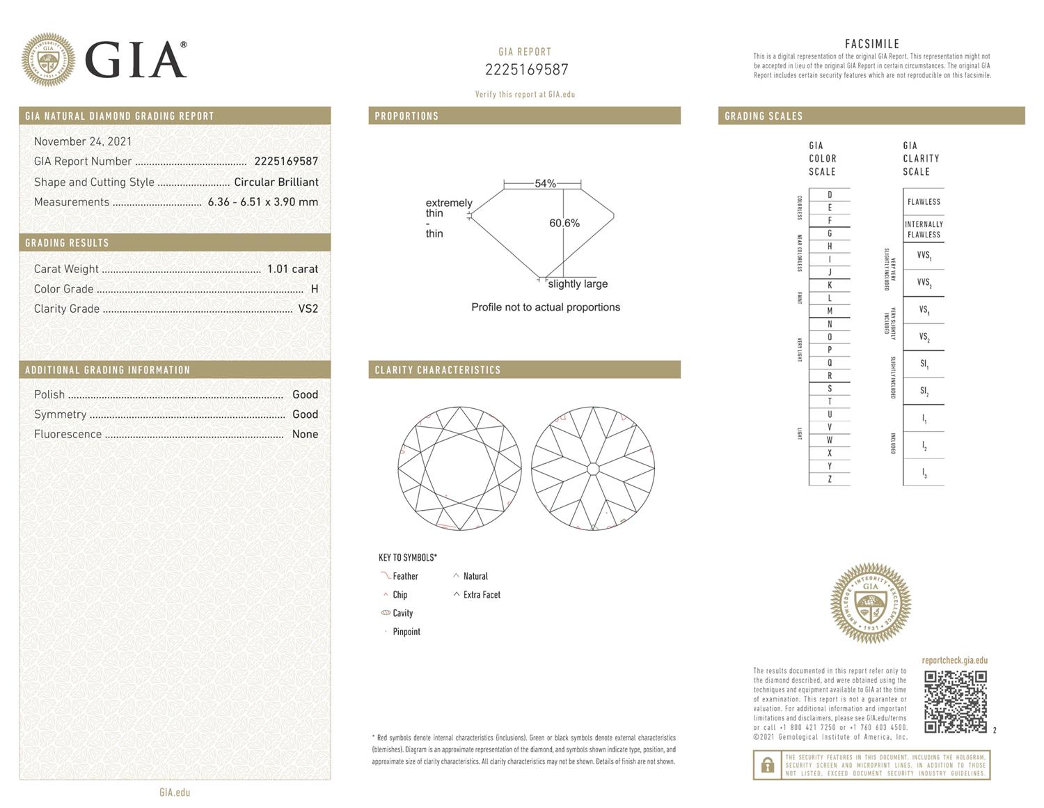 Accompanied by a GIA report numbered 2225169587, dated 24 November 2021, stating that the 1.01 carat diamond is natural, H colour, VS2 clarity.