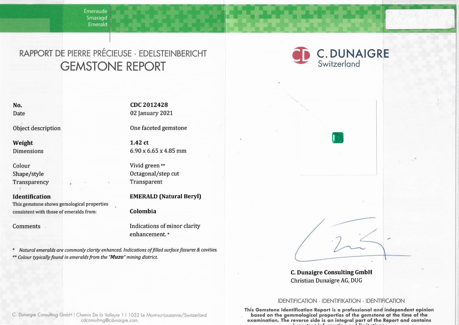 a C. Dunaigre report numbered CDC 2012428 dated 2 January 2021, stating that the 1.42 carat vivid green emerald is natural, with indications of minor clarity enhancement, of Colombia origin;