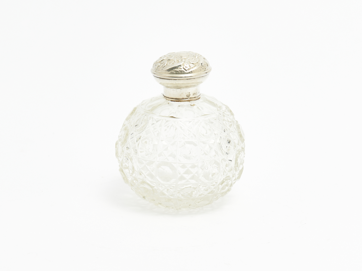 A STERLING SILVER LIDDED HOBNAIL CUT CRYSTAL PERFUME BOTTLE WITH ORIGINAL STOPPER H.11CM, LEONARD JOEL LOCAL DELIVERY: SMALL