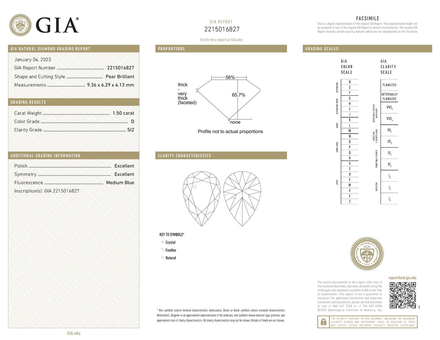 a GIA report numbered 2215016827, dated 4 January 2023, stating that the 1.50 carat diamond is natural, D colour, SI2 clarity, laser inscribed;