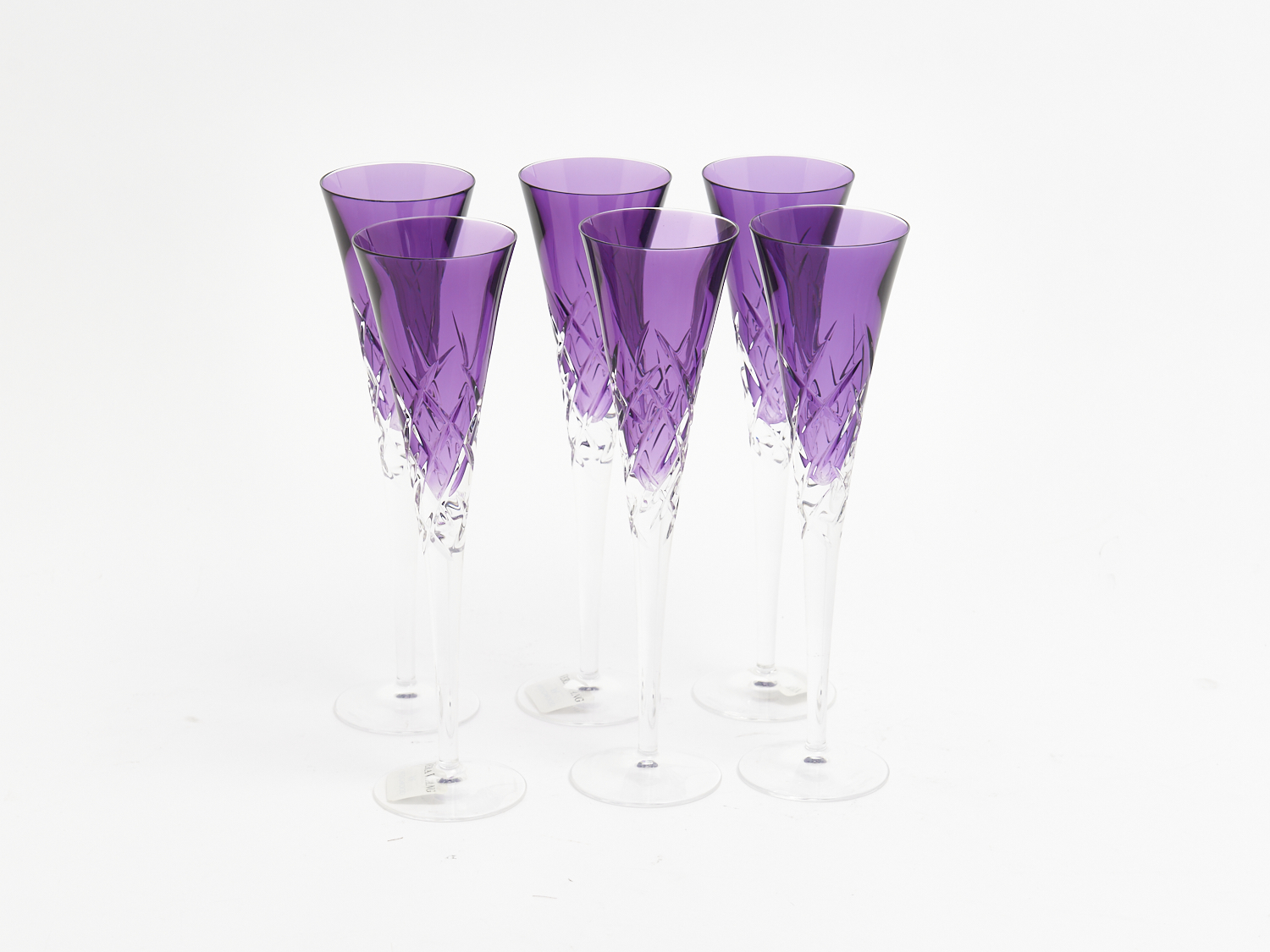 THREE PAIRS OF COLOURED CRYSTAL FLUTES BY VERA WANG FOR WEDGWOOD, IN BOXES H.28CM, LEONARD JOEL LOCAL DELIVERY: SMALL