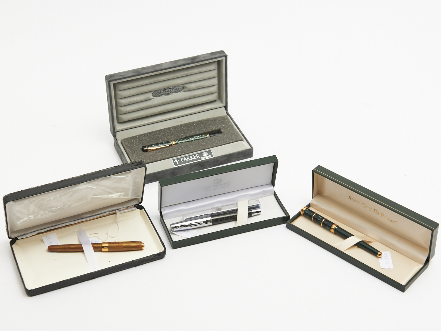 FOUR FOUNTAIN PENS INCLUDING TWO PARKER FOUNTAIN PENS WITH 18K GOLD NIBS, PERRAZ AND MONTE VERDE, ALL BOXED, LEONARD JOEL LOCAL DELIVERY: SMALL