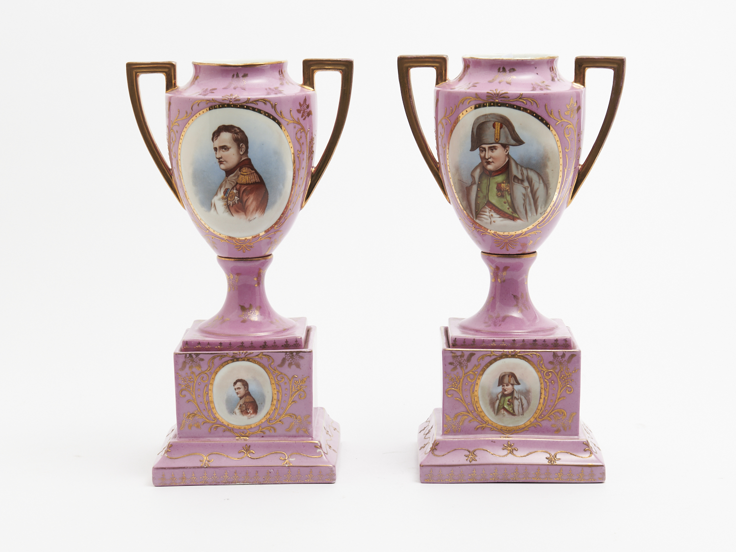 A PAIR OF ROYAL VIENNA HANDLED URNS ON STANDS H.43.5CM, LEONARD JOEL LOCAL DELIVERY: SMALL