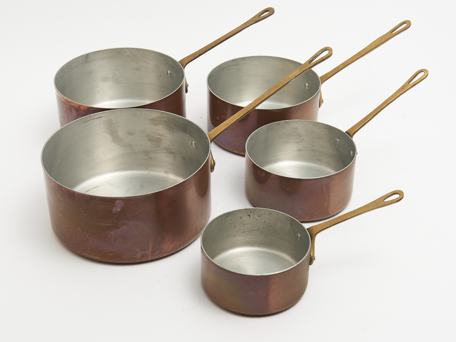A GRADUATED SET OF FIVE FRENCH COPPER AND BRASS HANDLED SAUCEPANS DIA.20CM, LEONARD JOEL LOCAL DELIVERY: MEDIUM