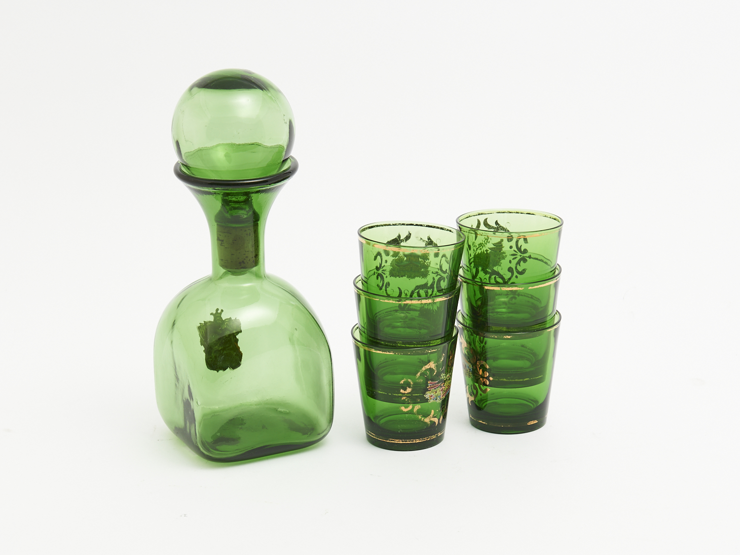 A GREEN GLASS DECANTER AND MATCHED SET OF SIX TUMBLERS H.28CM (TALLEST), LEONARD JOEL LOCAL DELIVERY: MEDIUM