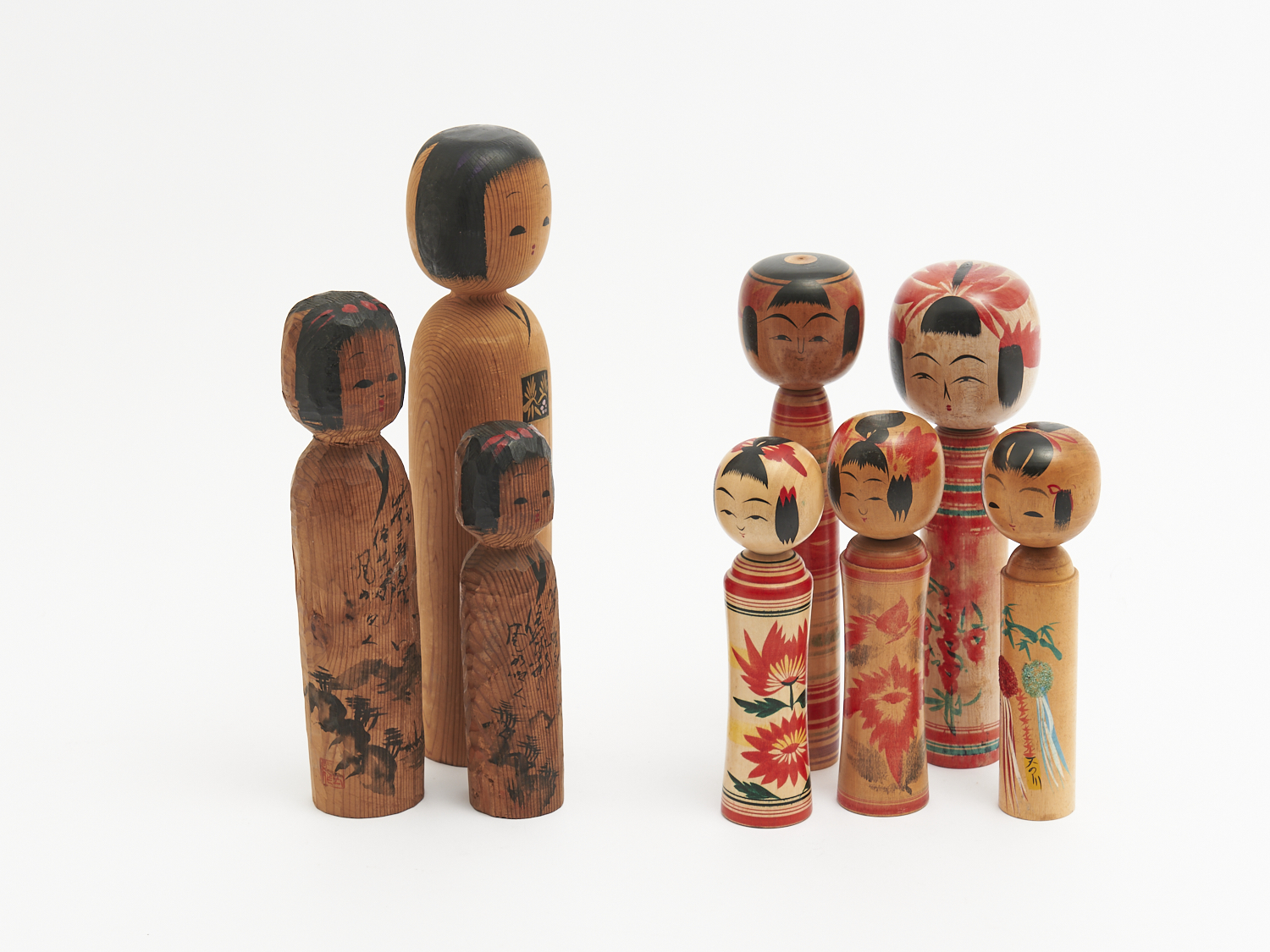 EIGHT VINTAGE HANDCARVED AND PAINTED WOODEN KOKESHI DOLLS, LEONARD JOEL LOCAL DELIVERY: MEDIUM