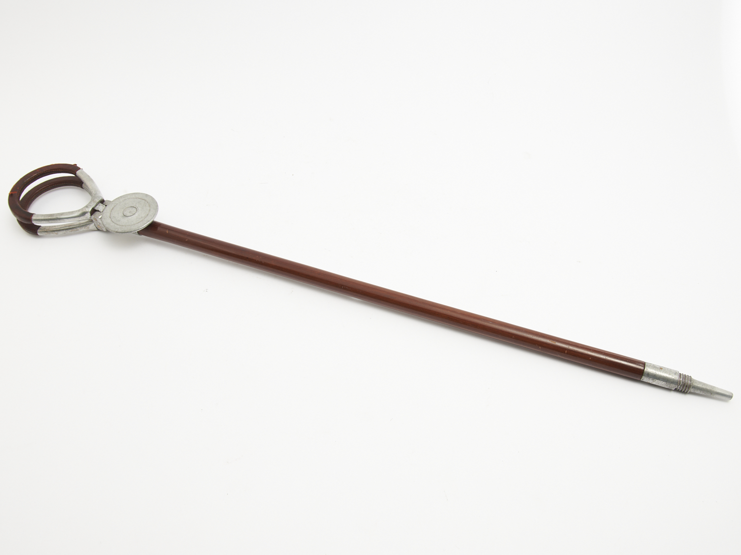 A VINTAGE ENGLISH MADE HOWELL THE 'CADET' SEAT FOLDING WALKING STICK/SHOOTING STICK WITH LEATHER HANDLE L.85CM, LEONARD JOEL LOCAL DELIVERY: SMALL