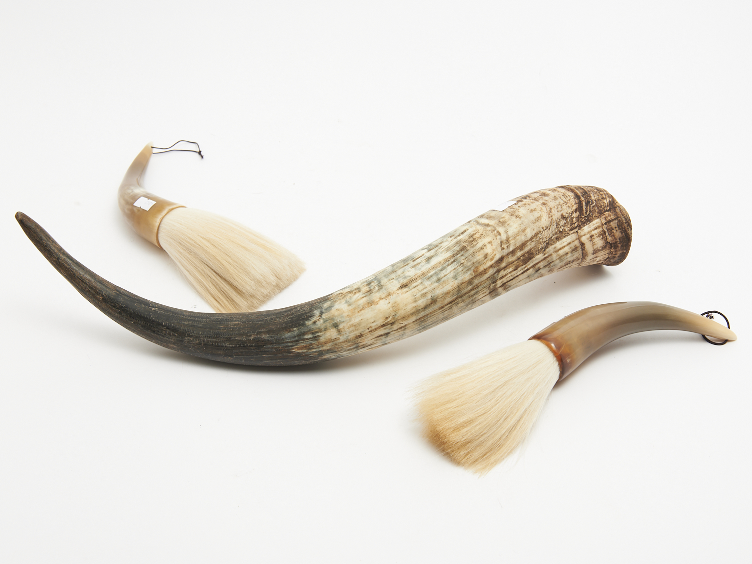 TWO CALLIGRAPHY BRUSHES WITH HORN HANDLES TOGETHER WITH A HORN L.53CM (HORN), LEONARD JOEL LOCAL DELIVERY: SMALL