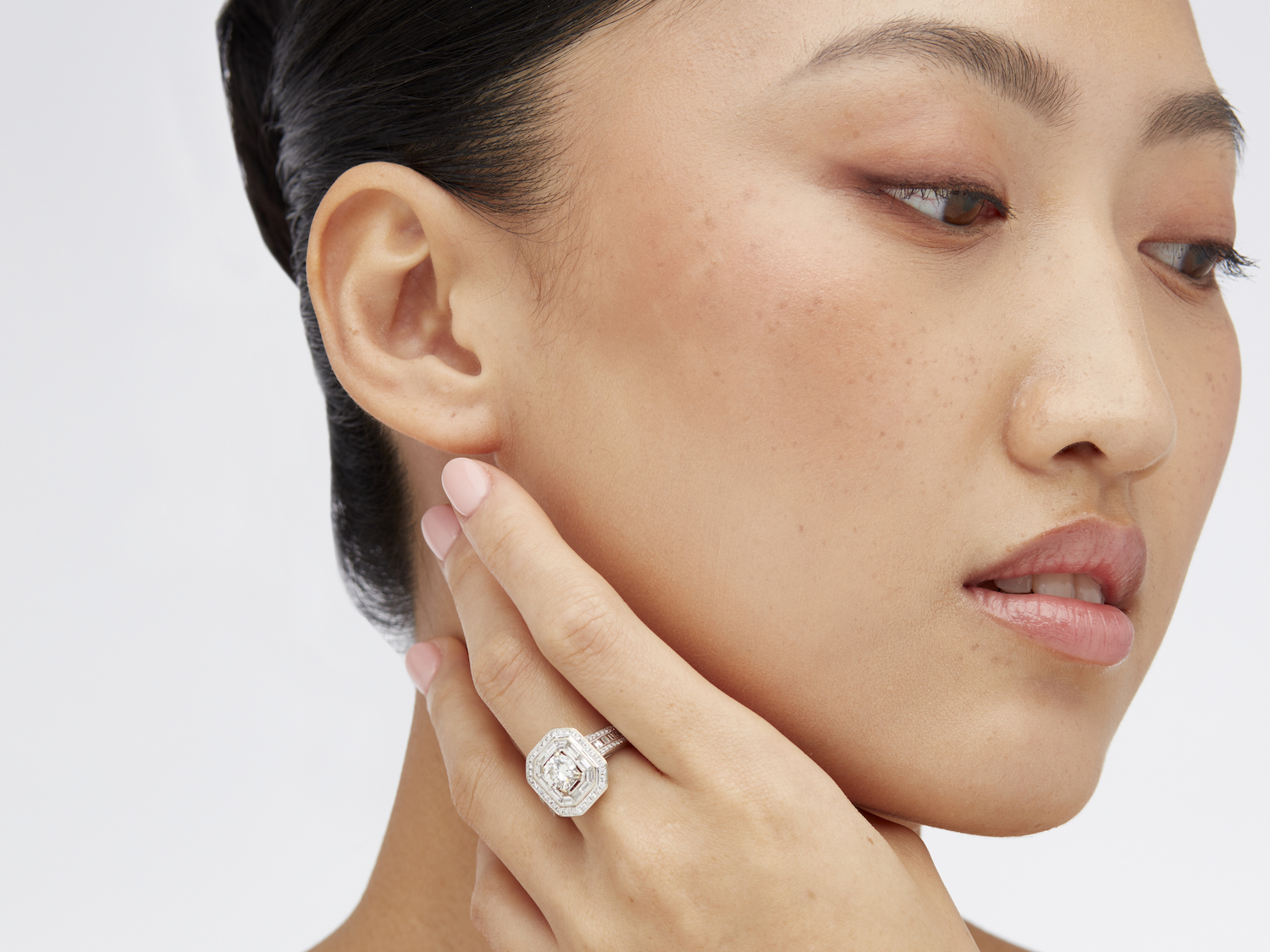 Of cluster design, centring a claw-set brilliant-cut diamond weighing approximately 0.90 carats, within an octagonally shaped surround of tapered baguette and brilliant-cut diamonds, the shoulders detailed with further baguette and brilliant-cut diamonds, the surrounding diamonds together weighing approximately 1.20 carat, size N.
