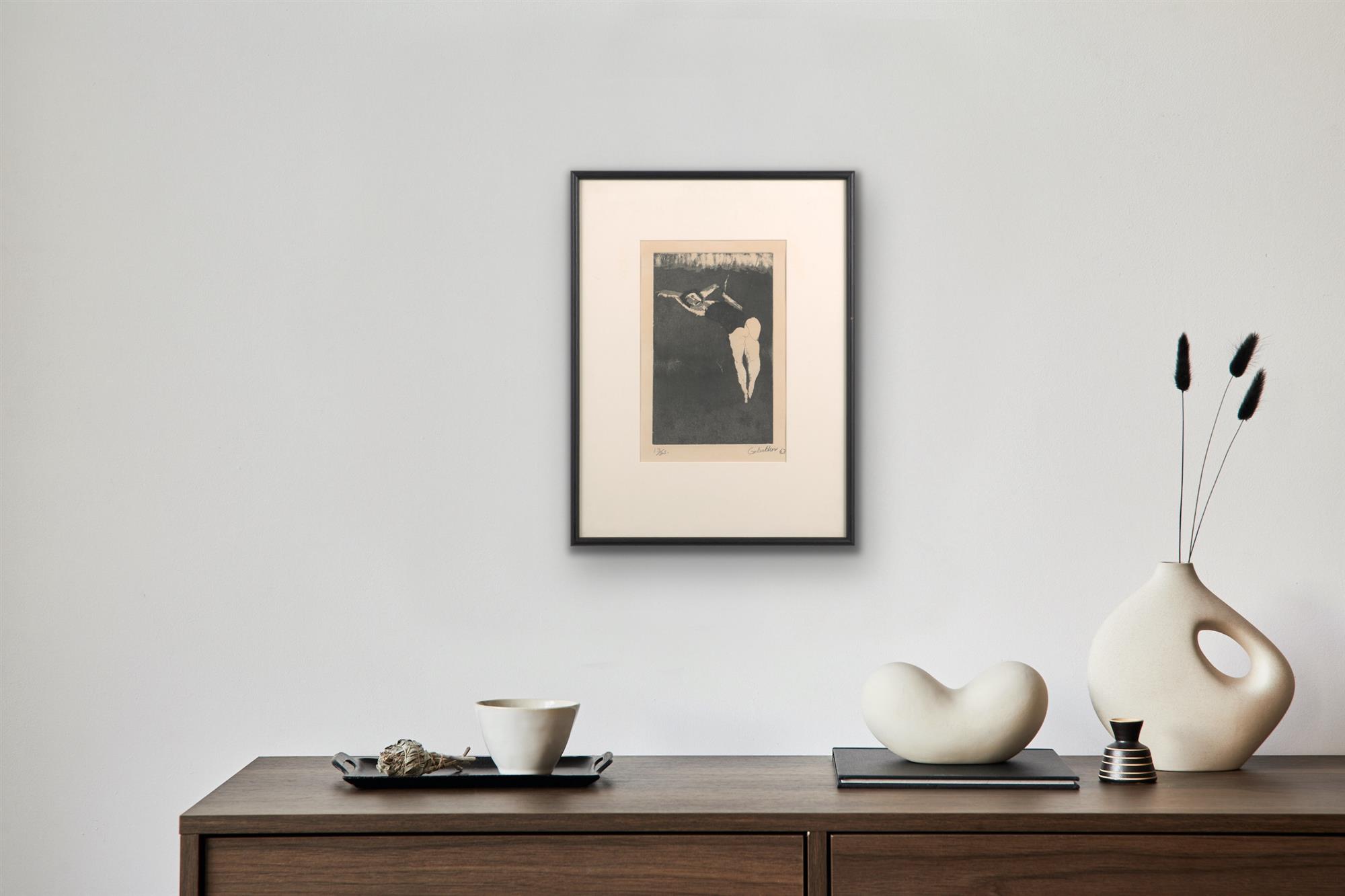 "Trapeze 1963 was etched in Milan while Baldessin was attending the Brera Academy, after leaving London where he, like (Fred) Williams, had attended the Chelsea School of Art. Trapeze was Baldessin's first print to be publicly shown, in the touring exhibition 'Australian Print Survey' of 1963-64. It was the first etching seen by Tate Adams who, impressed by young Baldessin, offered him a part-time lectureship in the RMIT print department of which Adams had been appointed Head in 1960. The etching plate, inked and varnished, was later hung on the wall of the Crossley Gallery." (Robert Lindsay p. 40)