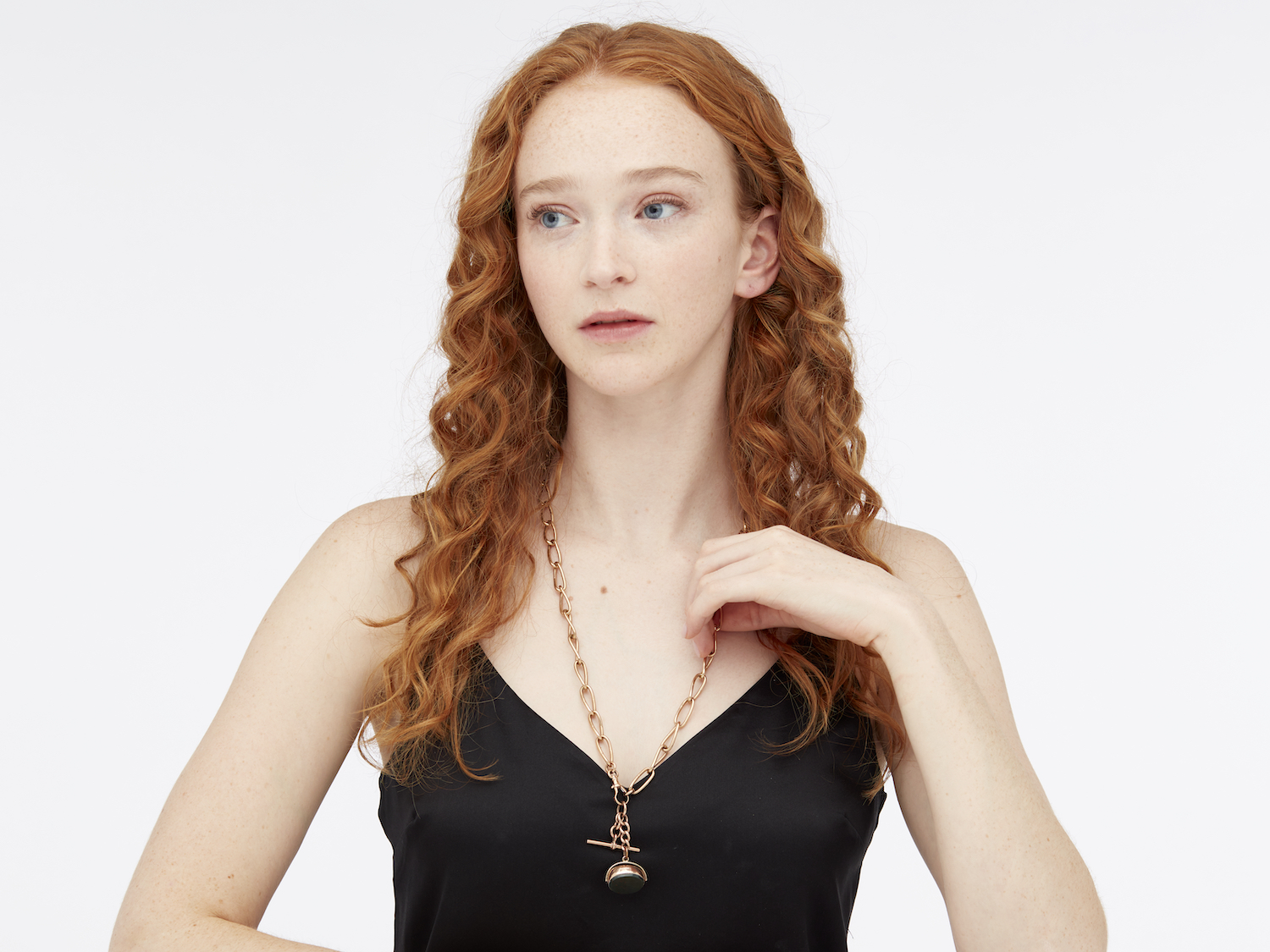 The elongated twisted curblink chain completed by a swivel clasp, suspending a t-bar fitting and carnelian/bloodstone spinner, Chester hallmarks circa 1906/7, chain length approximately 670mm, gross weight approximately 74.1grams