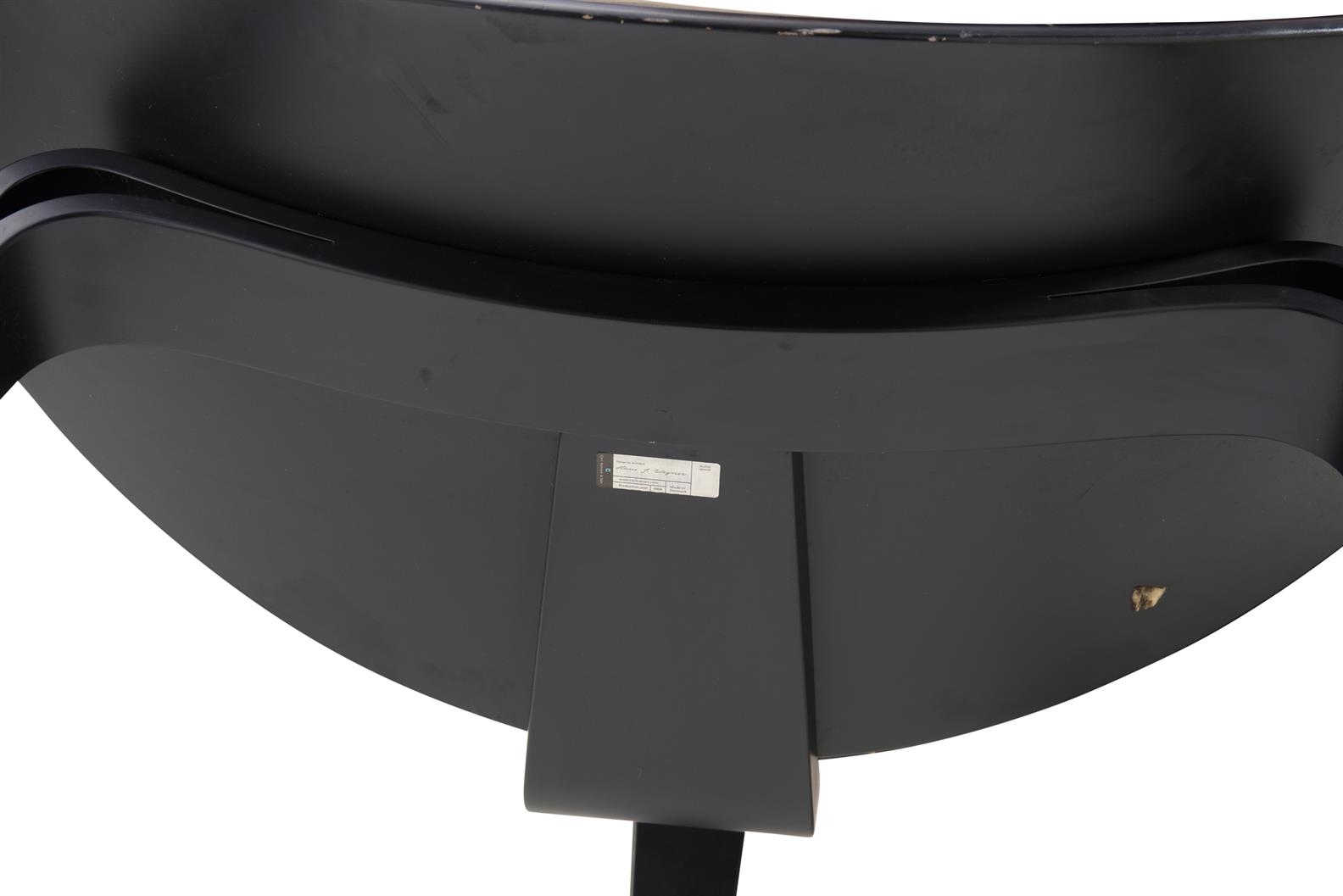 Black painted pressed laminated veneer and wood. Brown leather cushioning to seats and backs. Stickered to undersides.