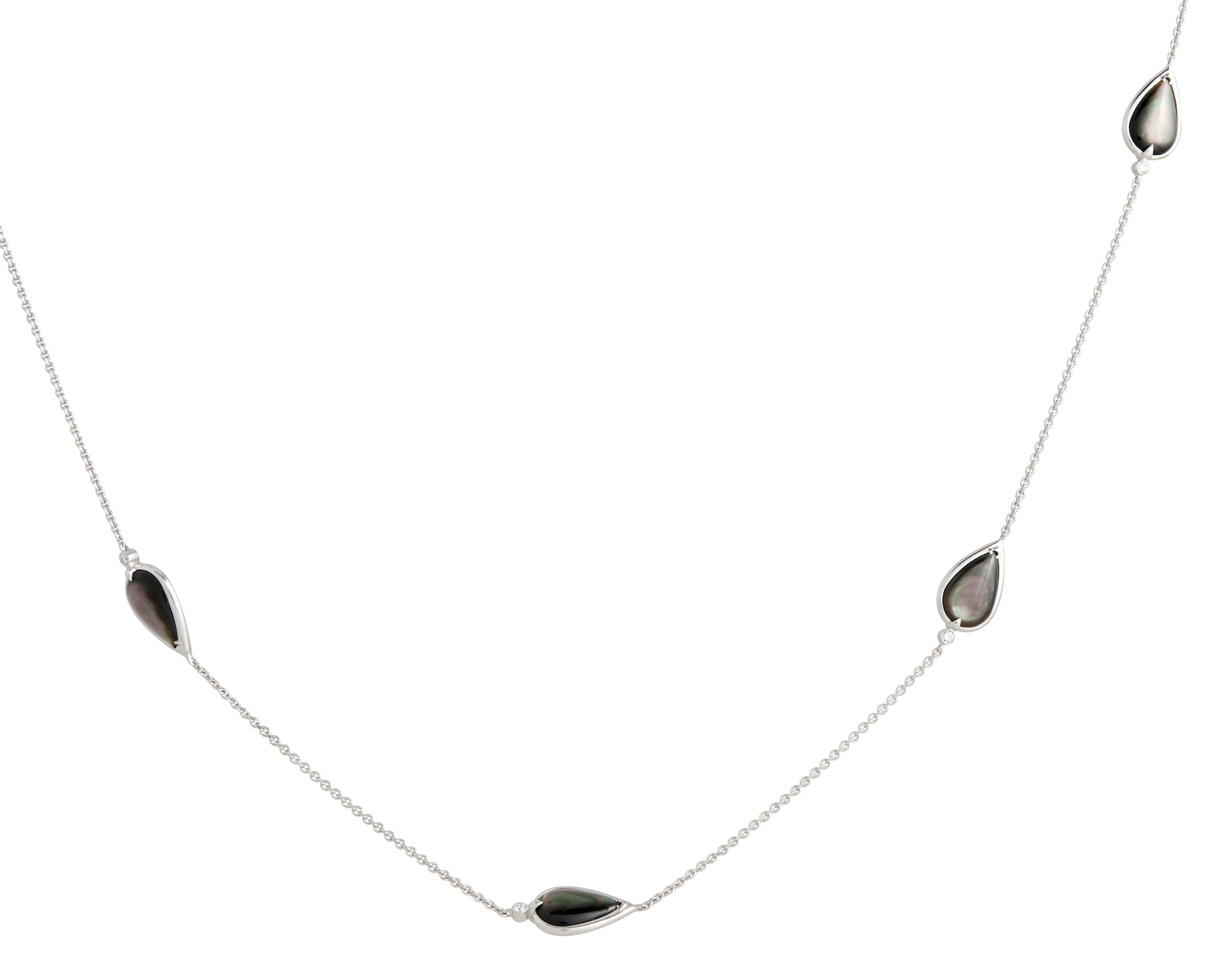 The long chain set at intervals with pear-shaped mother-of-pearl plaques and brilliant-cut diamonds, completed by a parrot clasp,