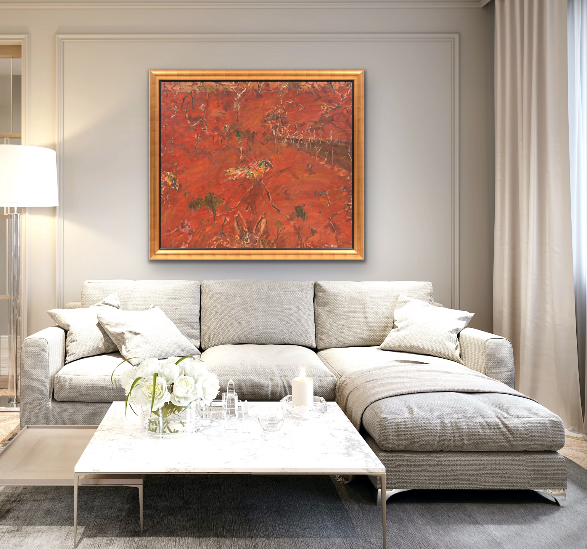 John Olsen has a unique understanding and appreciation of the Australian landscape. His appreciation of the natural world ever changing and growing transcends onto the canvas through his ability to portray life and movement within the landscape. In 1990, John Olsen and his wife moved to Chapel House Farm at Rydal, near Bathurst in the Central Tablelands of New South Wales. The residence and surrounding landscape were of significant influence to Olsen throughout the ensuing years. The town carried a modest population of no more than one hundred, but the landscape afforded Olsen all the luxuries of Australia's natural beauty. Often painting en plein air, Olsen captured the daily wonder of his new home in Rydal. In this work we see a glimpse of a rabbit at the base, beneath a bird perched on a nearby branch. The colour palette of predominantly deep reds and browns, to capture the rich ochres of the land, are offset with flickers of greens and blues to capture the movement of the inhabiting flora and fauna. During his time at Rydal, Olsen also produced the masterpiece Summer at Rydal 1997 which was a finalist in the Art Gallery of New South Wales' Wynne Prize as well as a diptych Spring at Rydal earlier in 1992.