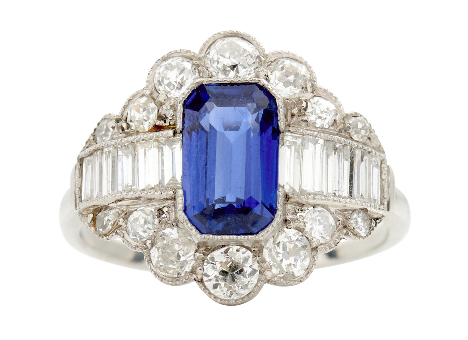 Of cluster design, centring a millegrain-set rectangular step-cut sapphire weighing approximately 1.40 carats, flanked by a row of channel-set baguette diamonds, further accented by a surround of old round-cut diamonds, the diamonds together weighing approximately 1.00 carat, mounted in platinum, size K1/2, total gross weight approximately 3 grams.