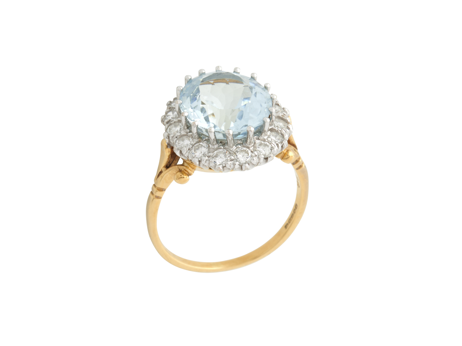 Of cluster design, centring a claw-set oval-cut aquamarine weighing approximately 5.30 carats, within a surround of sixteen claw-set brilliant-cut diamonds together weighing approximately 0.40 carats, London hallmarks, size Q.