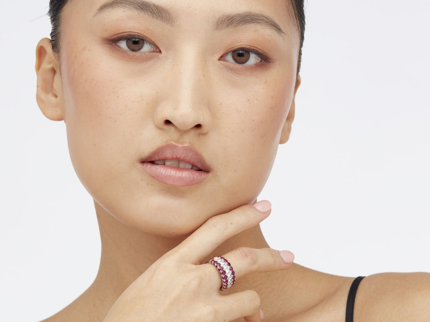 Of half hoop design, centring a row of nine brilliant-cut diamonds together weighing approximately 0.60 carats, flanked by rows of circular-cut rubies together weighing approximately 1.20 carats, size P.