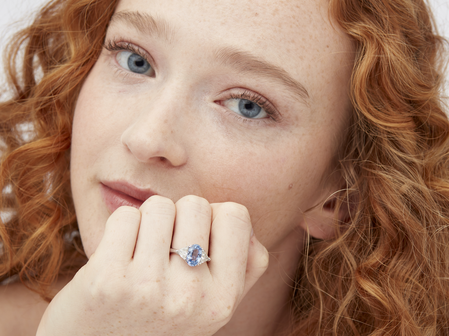 Claw set-with an oval-cut sapphire weighing approximately 3.24 carats, flanked by claw-set trilliant-cut diamonds together weighing approximately 1.13 carats, size M 1/2.