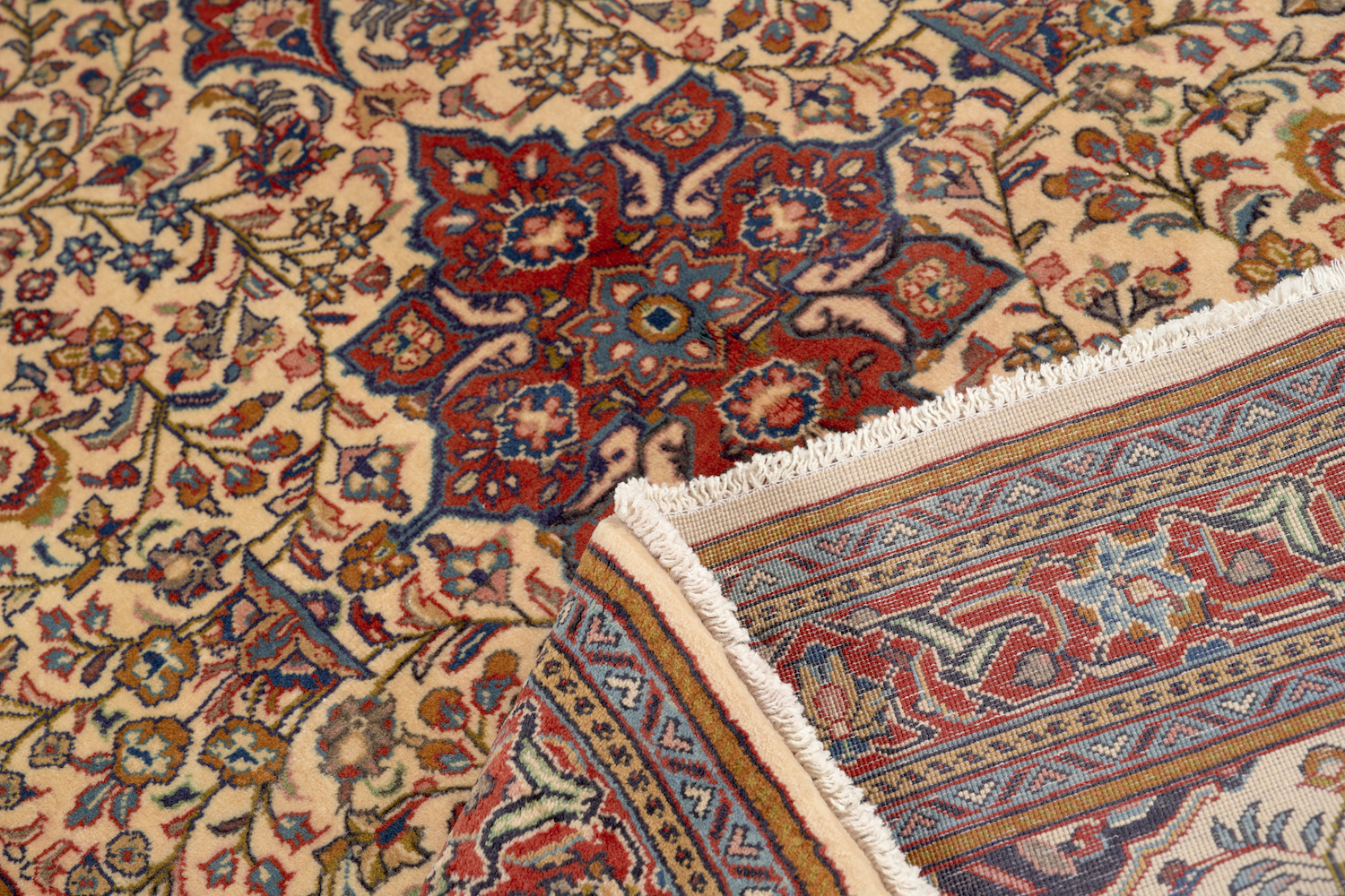 A PERSIAN SAROUQ RUG, 100% LAMBS WOOL. VERY SOLID HAND-KNOTTED WEAVE WITH CLASSIC PERSIAN CENTRAL MEDALLION ON A CREAM FIELD OF ALL OVER FLORAL DESIGN, SAZ LEAVES AND FLORAL SPRAYS. FLORAL BORDER IN RED OF ROSETTES. SIZE: 215 X 132 CM ORIGIN: PERSIA – RRP: $2,500 DOCUMENTATION OF AUTHENTICITY INCLUDED.