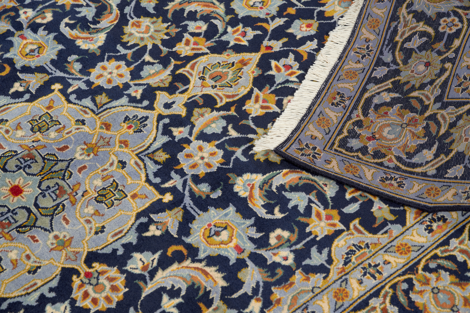 A PERSIAN ‘ROSE GARDEN' DESIGN KASHAN CARPET. WITH 100% WOOL PILE SOLID AND DENSELY HAND KNOTTED IN TRADITIONAL DESIGN OF CENTRAL ELONGATED MEDALLION IN FRENCH BLUE, GOLD AND SAGE GREEN ON A DEEP NAVY FIELD OF ALL OVER SHA ABBASI PALMETTES AND SAZ LEAVES IN TONES OF CHAMPAGNE, GOLD AND FRENCH BLUE. SIZE: 220 X 138 CM ORIGIN: PERSIA – RRP: $2,900 DOCUMENTATION OF AUTHENTICITY INCLUDED.