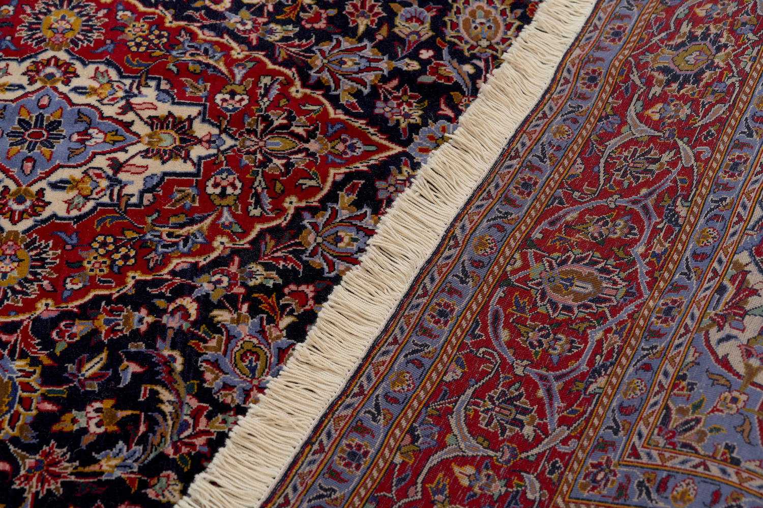 A BEAUTIFUL SUPERFINE HAND-KNOTTED PERSIAN ROYAL KASHAN RUG, 100% FINE LAMBS WOOL. CLASSIC KASHAN DESIGN OF A CENTRAL ELONGATED MEDALLION IN ROYAL RED ON A DEEP INDIGO ROYAL BLUE FIELD. WITH ALL-OVER SHAH ABBASI PALMETTES, SCROLLS, FLORAL MOTIFS & SAZ LEAVES. FLORAL CORNER MEDALLIONS IN FRENCH BLUE, IVORY AND RED. MAJOR BORDER OF SHAH ABBASI PALMETTES AND ESLIMI SCROLLS. IN PRISTINE CONDITION. SIZE: 222 X 145 CM ORIGIN: KASHAN/IRAN – RRP: $5,800 DOCUMENTATION OF AUTHENTICITY INCLUDED.