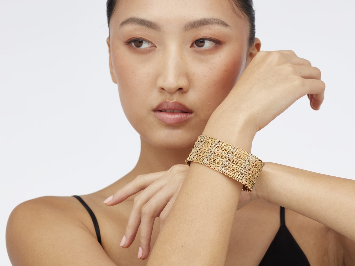 The wide strap comprising of textured fancy links, completed by a tongue and groove clasp, length approximately 195mm, gross weight approximately 83.0 grams.