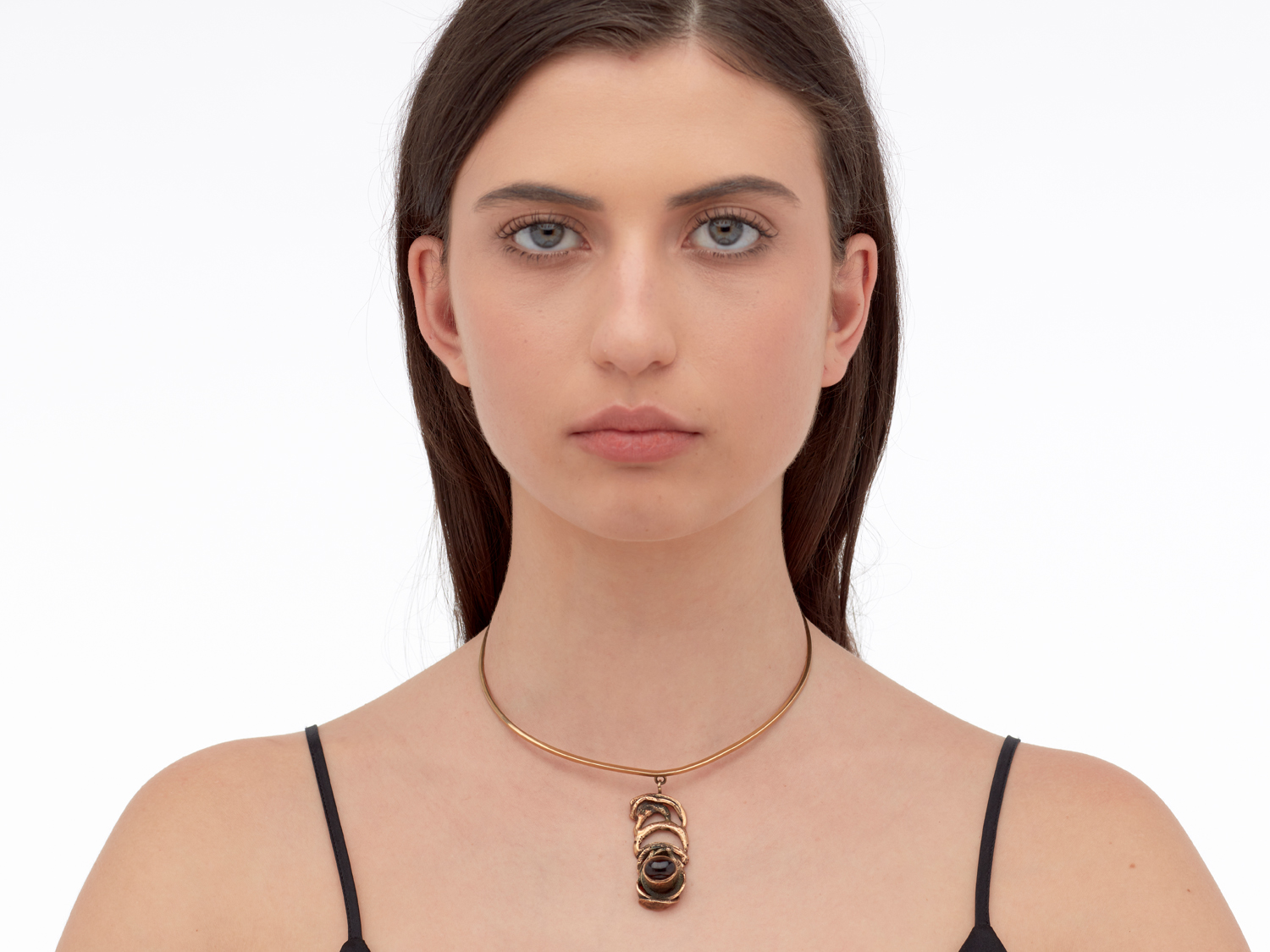 Comprising a modernist style drop pendant centring an oval garnet cut en cabochon, suspended from a structured collar,