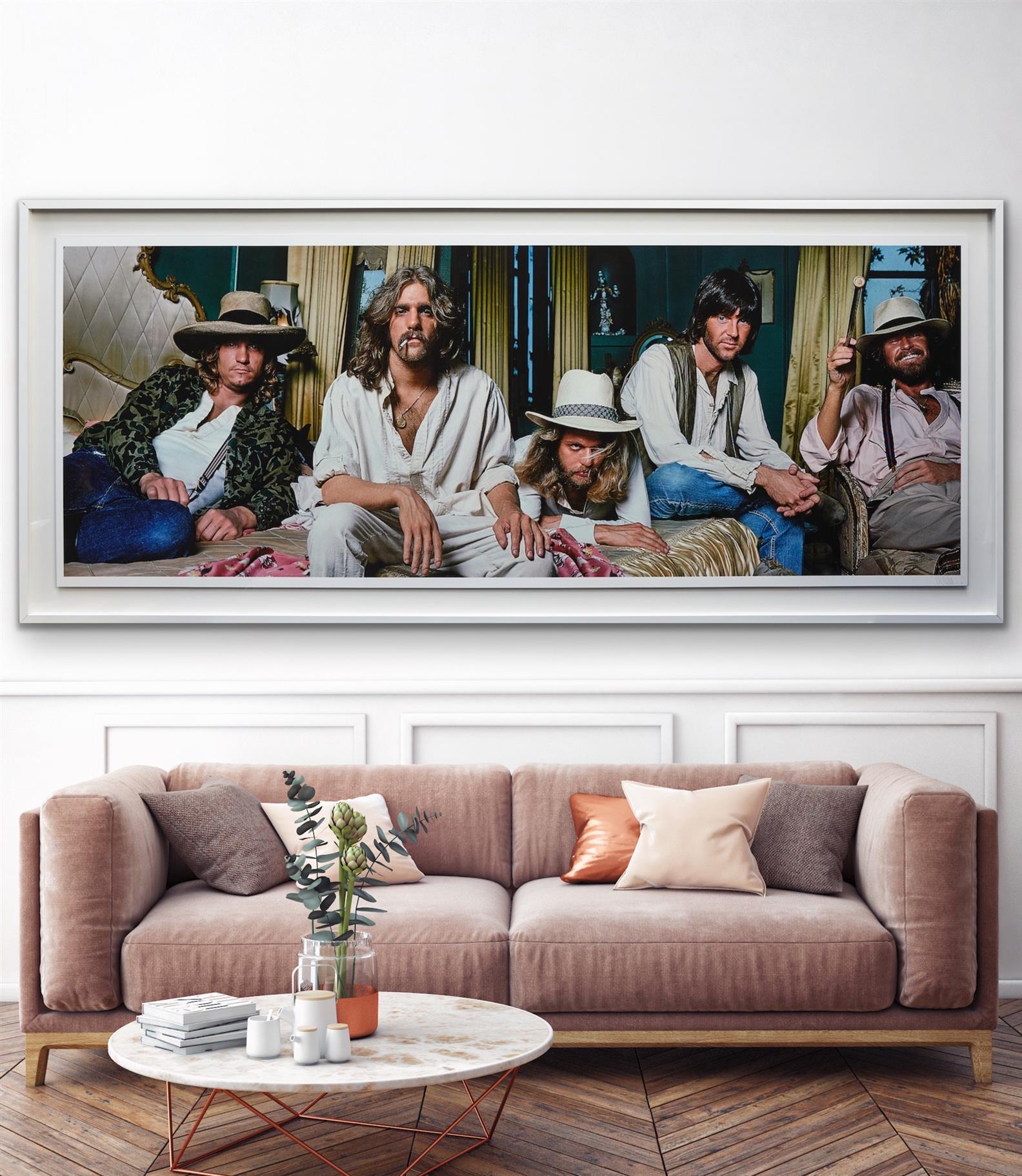 "Soon after commencing this session, the band walked out. I had no idea why at the time. A week later, I showed them a poster design I had created by combining a number of individual shots. They loved it and all was forgiven. It became a poster insert for the HOTEL CALIFORNIA album. I shot the Eagles 2 years later for a ROLLING STONE cover and recently re-designed the original poster in color for the re-release of the HOTEL CALIFORNIA vinyl. This is the result."
